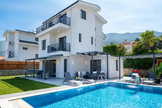 Villanın dış alanında özel yüzme havuzu, şezlonglar, güneşlenme terası ve geniş bir bahçe yer almaktadır. Bahçe içerisinde çocuklar için özel olarak hazırlanan oyun alanı sayesinde, aileler güvenli ve keyifli bir tatil geçirebilir. Hem çocuklar hem de yetişkinler için unutulmaz bir tatil ortamı sunan Villa Kleopatra, aileler ve arkadaş grupları için oldukça uygundur.