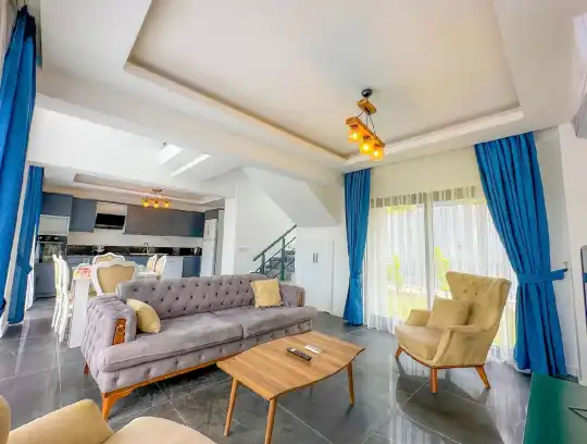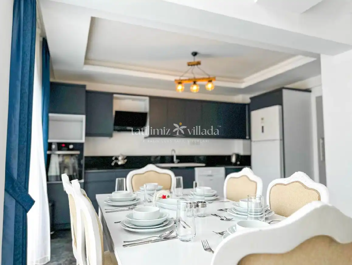 Tam donanımlı mutfağı, yemek hazırlamak isteyen misafirler için gerekli tüm ekipmanları sunarken, şık oturma alanı ise sevdiklerinizle birlikte keyifli vakit geçirmeniz için ideal bir ortam sağlar.