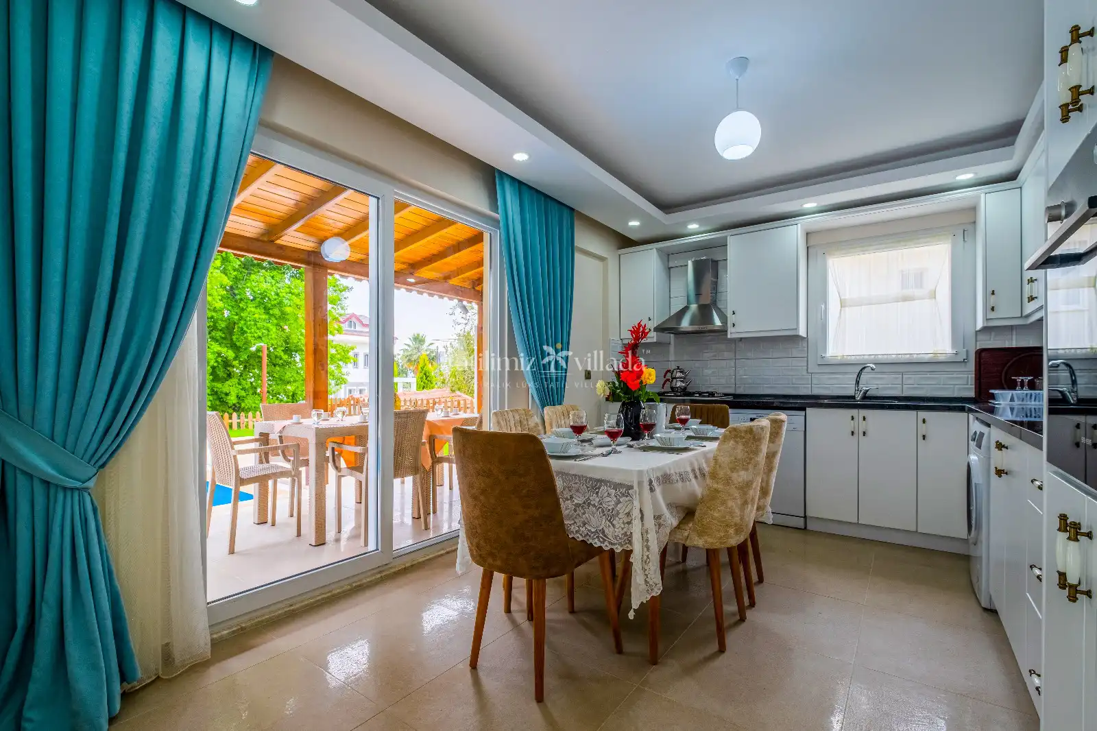 Villanın dış alanında özel yüzme havuzu, şezlonglar, güneşlenme alanı ve oturma grubu yer almaktadır. Bahçe alanı keyifli vakit geçirmek ve dinlenmek için uygun şekilde düzenlenmiştir. Güneşli günlerde havuz başında serinleyebilir, akşam saatlerinde bahçede sevdiklerinizle keyifli anlar yaşayabilirsiniz. Villa Lilly 1’in en büyük avantajlarından biri de plaja olan yakın konumudur. Çalış Plajı’na yürüyerek kolayca ulaşabilir, gün boyunca deniz ve güneşin tadını çıkarabilirsiniz.