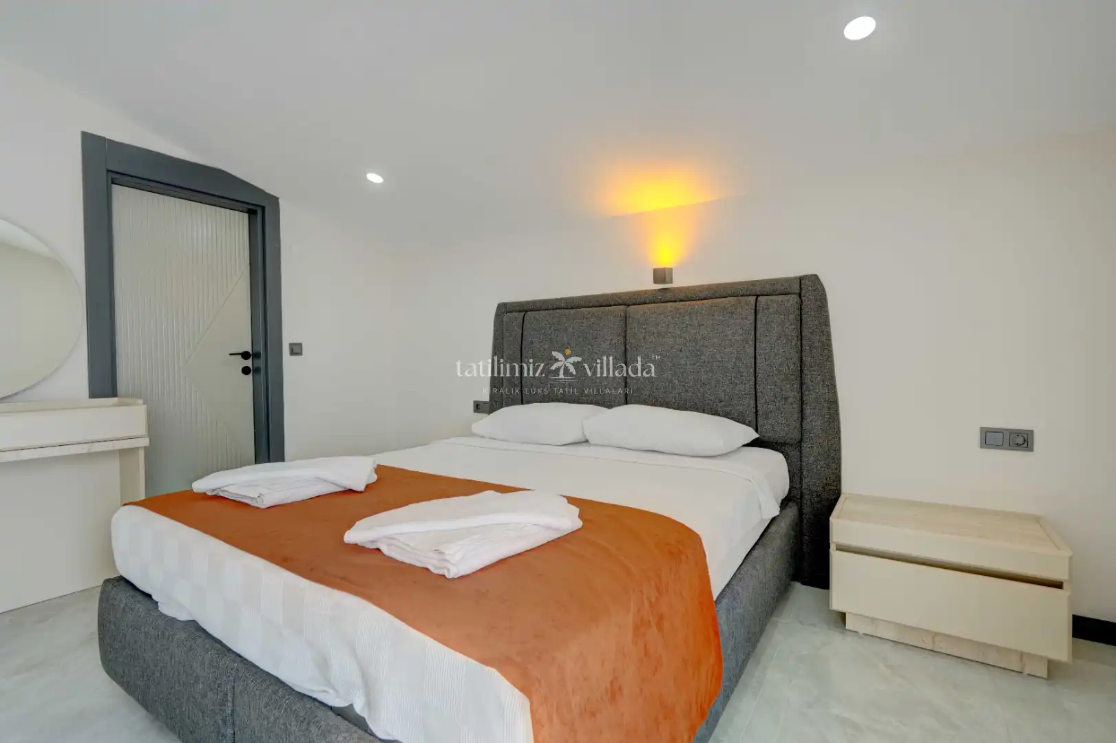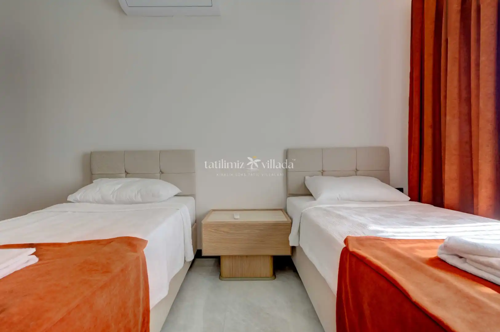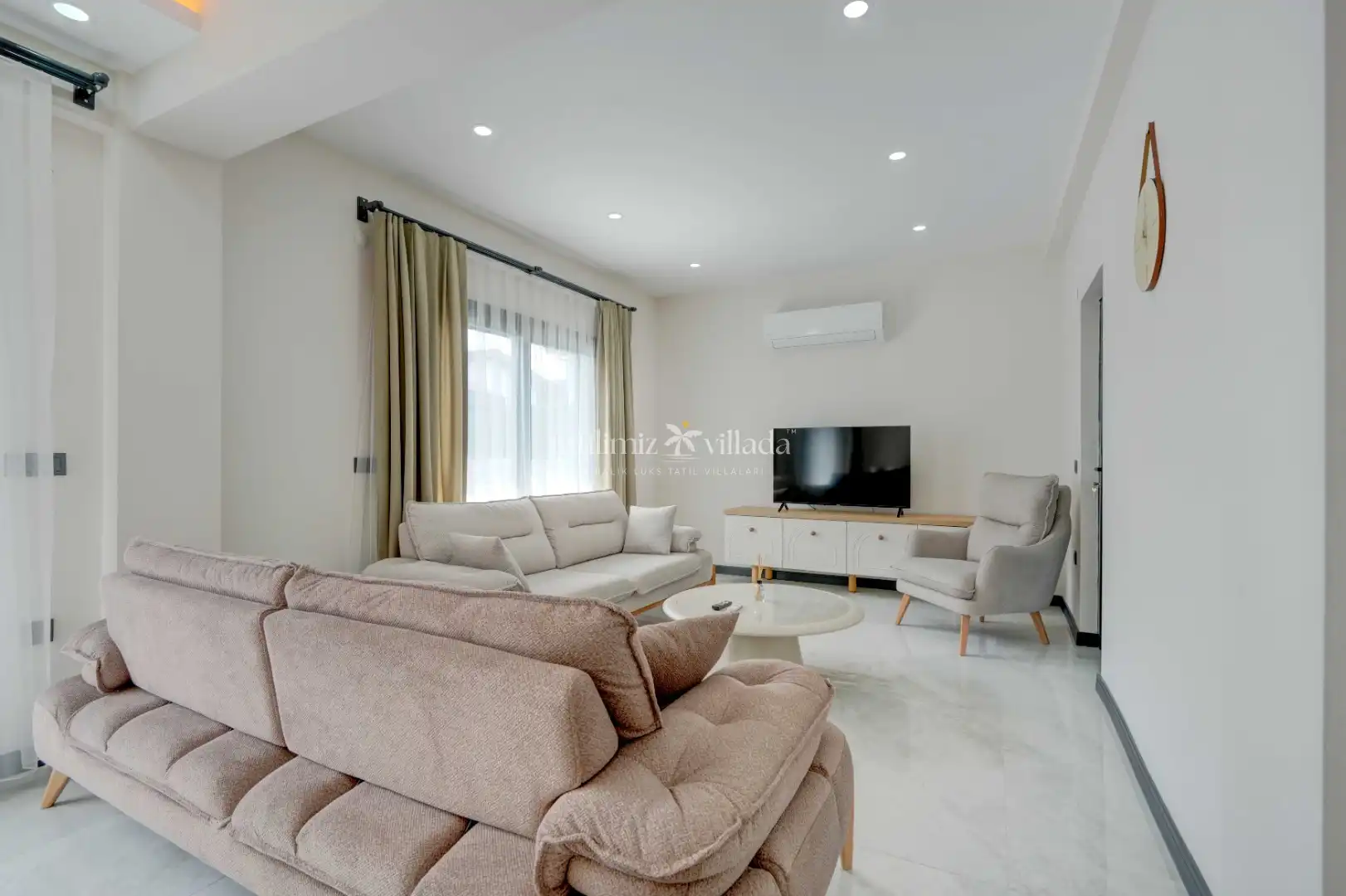 Villanın dış alanında özel yüzme havuzu, şezlong takımı, oturma grubu ve barbekü alanı yer almaktadır. İç mekanda ise modern ve konforlu bir oturma odası ile tam donanımlı açık mutfak bulunmaktadır. Birinci yatak odasında çift kişilik yatak, jakuzi ve ebeveyn banyosu; ikinci yatak odasında çift kişilik yatak; üçüncü yatak odasında iki tek kişilik yatak; dördüncü yatak odasında ise çift kişilik yatak yer almakta olup ayrıca ortak kullanım banyolar da mevcuttur.