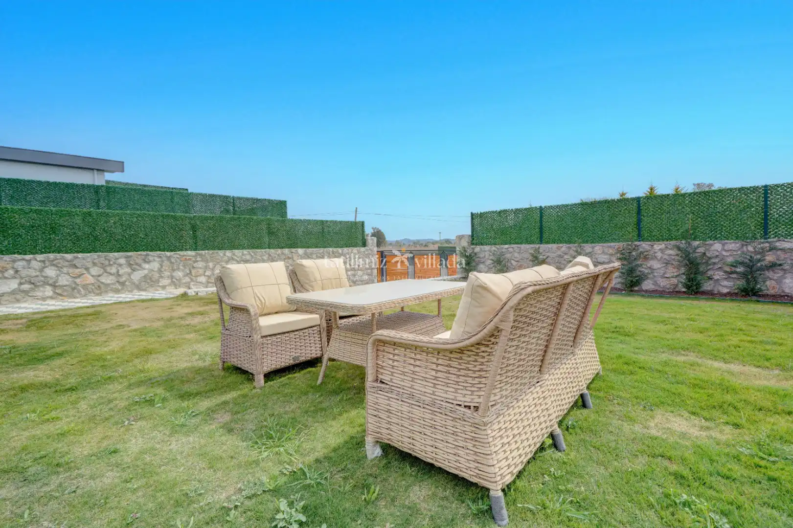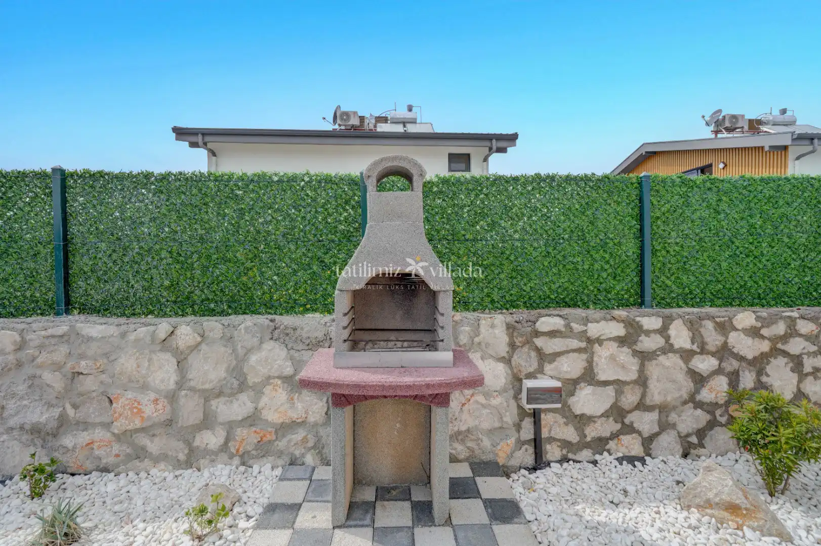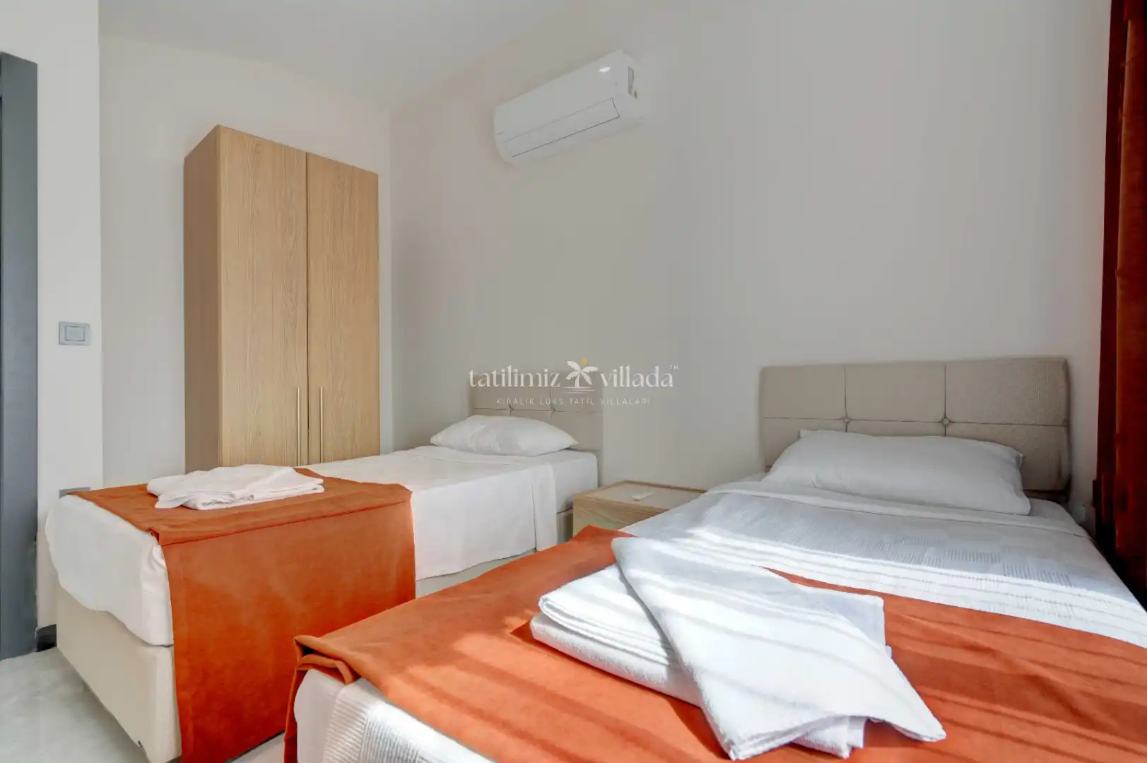 Villanın dış alanında özel yüzme havuzu, şezlong takımı, oturma grubu ve barbekü alanı yer almaktadır. İç mekanda ise modern ve konforlu bir oturma odası ile tam donanımlı açık mutfak bulunmaktadır. Birinci yatak odasında çift kişilik yatak, jakuzi ve ebeveyn banyosu; ikinci yatak odasında çift kişilik yatak; üçüncü yatak odasında iki tek kişilik yatak; dördüncü yatak odasında ise çift kişilik yatak yer almakta olup ayrıca ortak kullanım banyolar da mevcuttur.