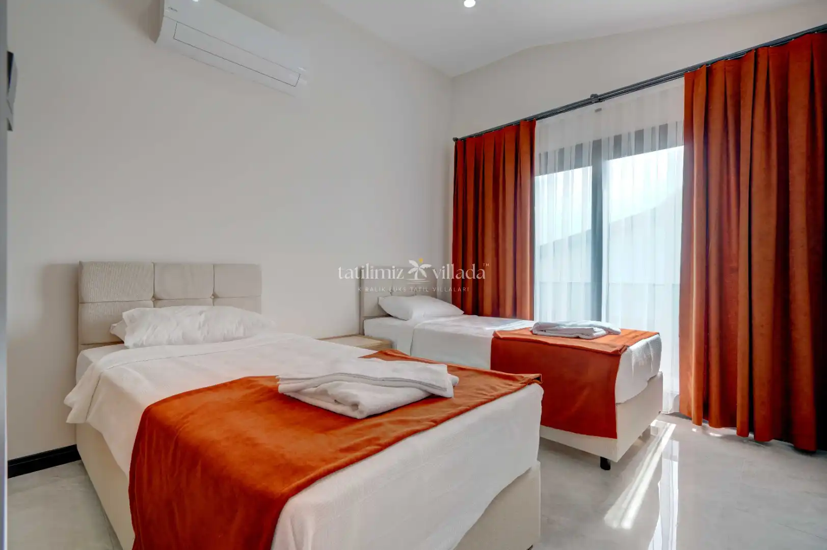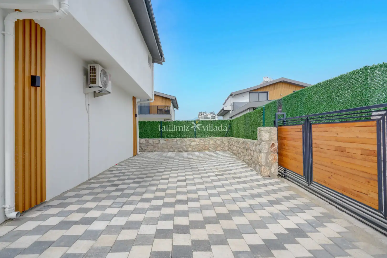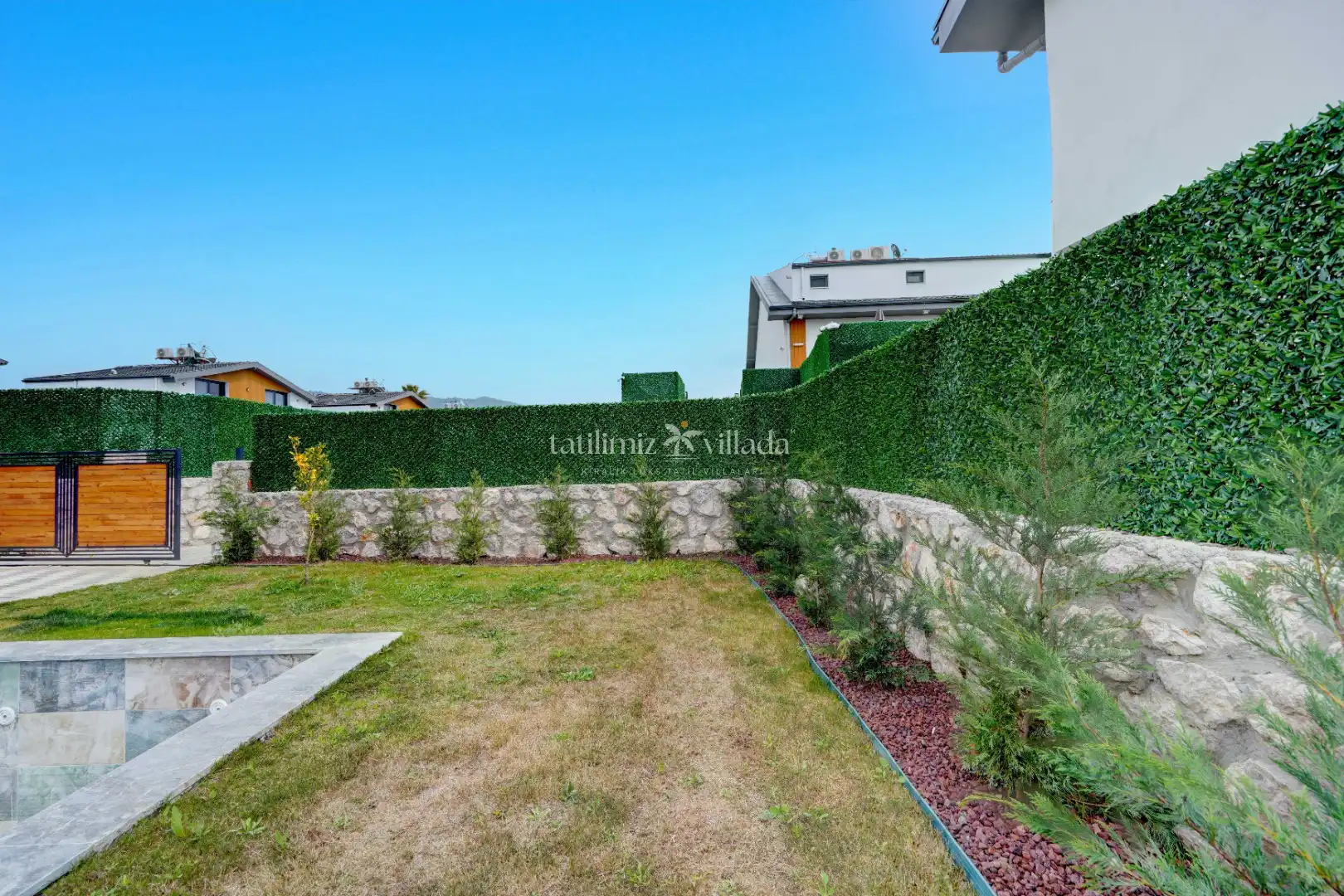 Villanın dış alanında özel yüzme havuzu, şezlong takımı, oturma grubu ve barbekü alanı yer almaktadır. İç mekanda ise modern ve konforlu bir oturma odası ile tam donanımlı açık mutfak bulunmaktadır. Birinci yatak odasında çift kişilik yatak, jakuzi ve ebeveyn banyosu; ikinci yatak odasında çift kişilik yatak; üçüncü yatak odasında iki tek kişilik yatak; dördüncü yatak odasında ise çift kişilik yatak yer almakta olup ayrıca ortak kullanım banyolar da mevcuttur.