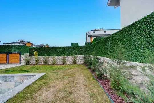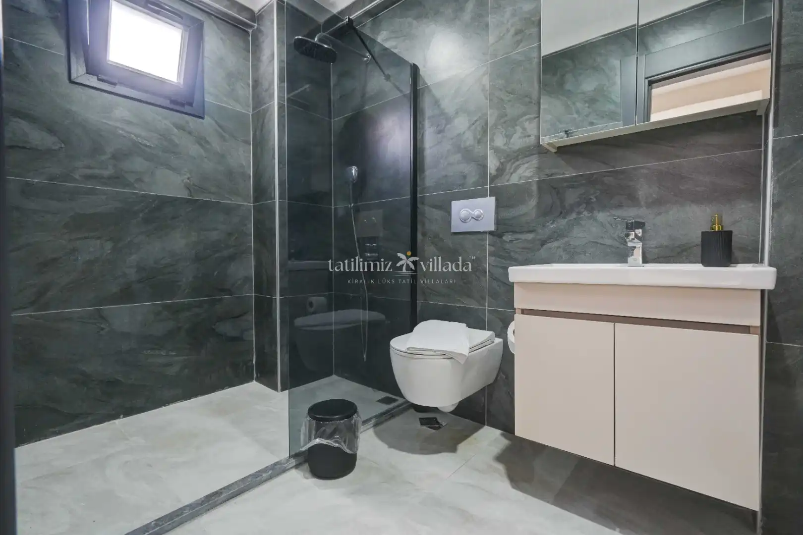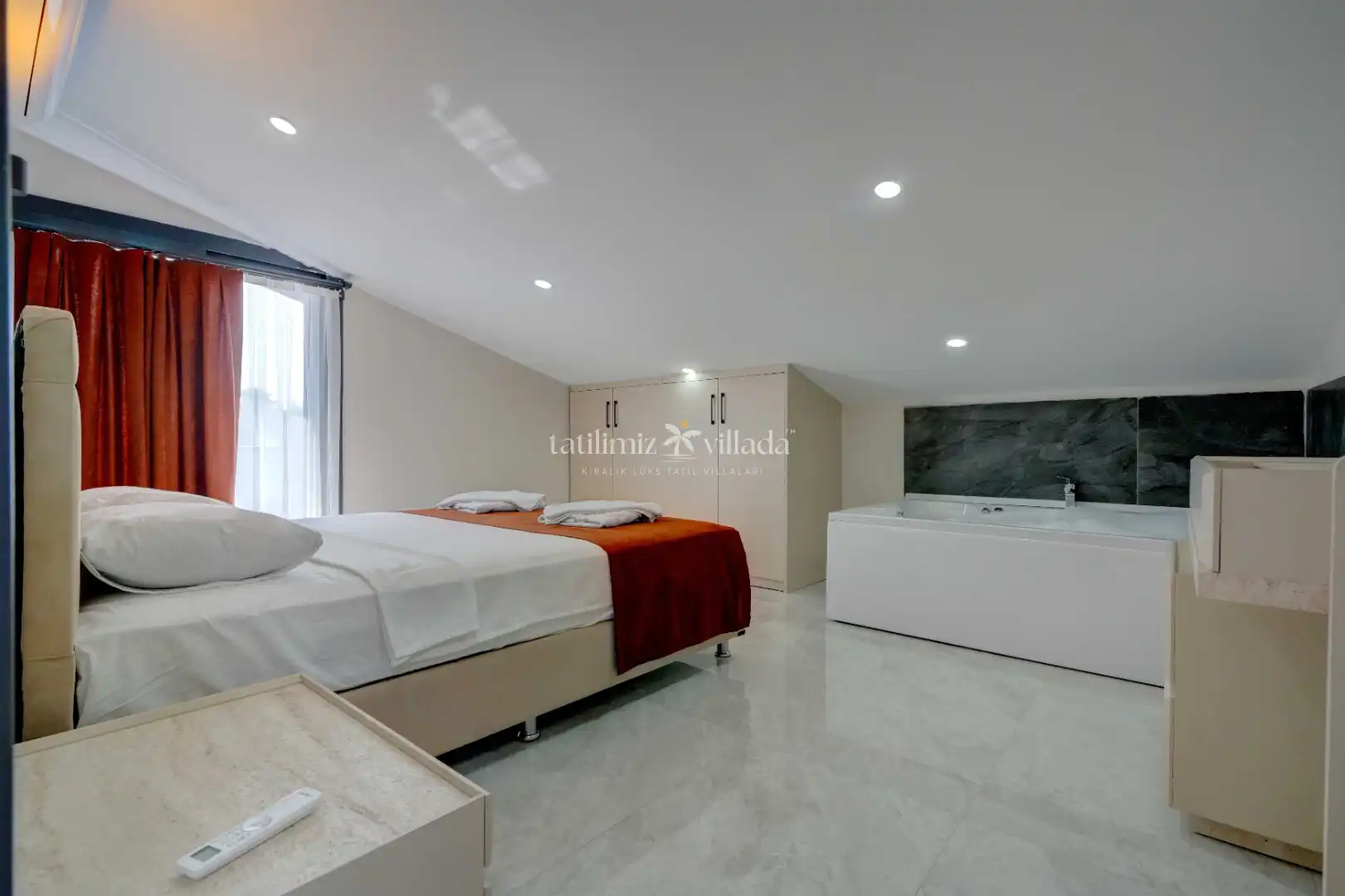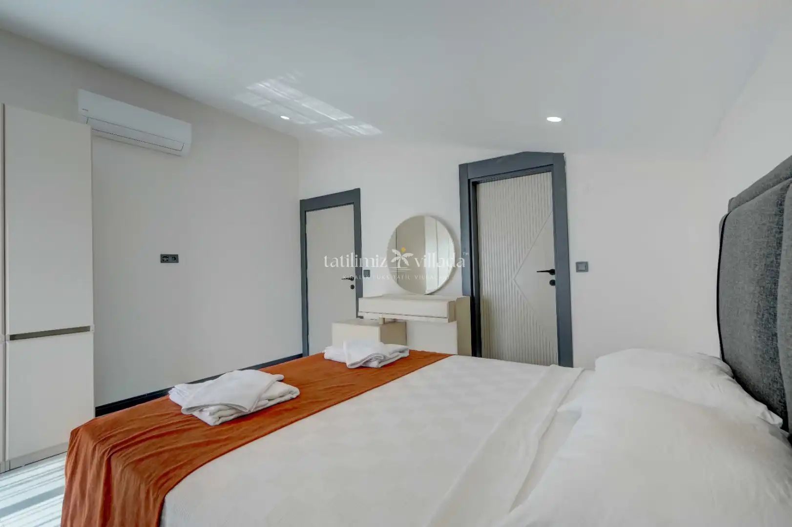 Villanın dış alanında özel yüzme havuzu, şezlong takımı, oturma grubu ve barbekü alanı yer almaktadır. İç mekanda ise modern ve konforlu bir oturma odası ile tam donanımlı açık mutfak bulunmaktadır. Birinci yatak odasında çift kişilik yatak, jakuzi ve ebeveyn banyosu; ikinci yatak odasında çift kişilik yatak; üçüncü yatak odasında iki tek kişilik yatak; dördüncü yatak odasında ise çift kişilik yatak yer almakta olup ayrıca ortak kullanım banyolar da mevcuttur.