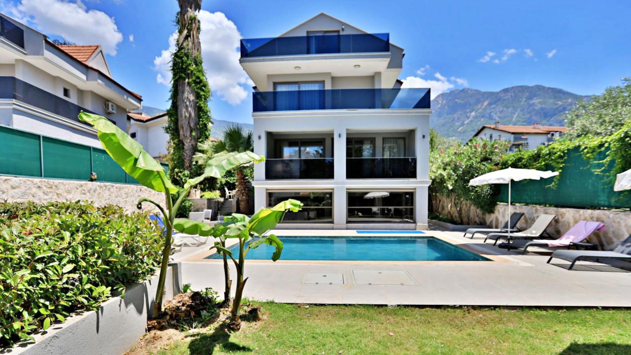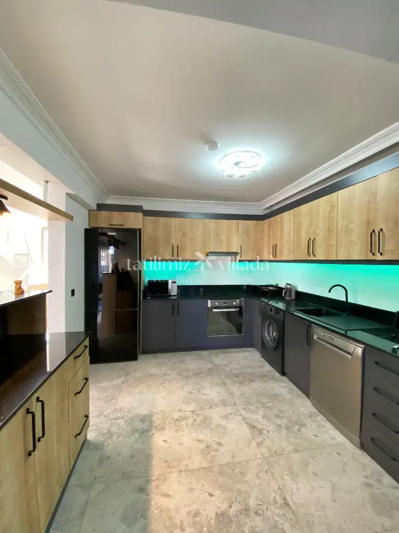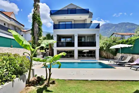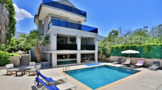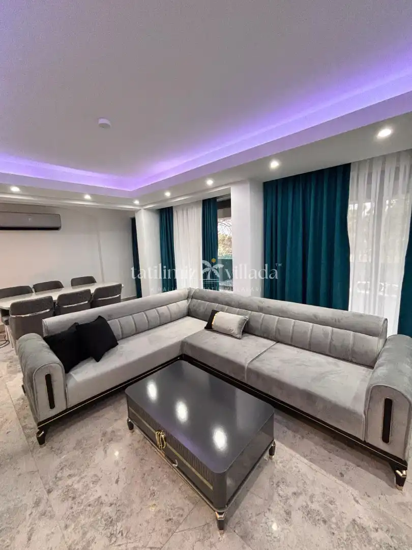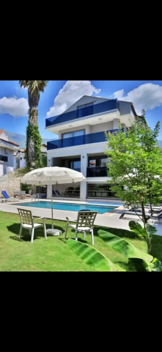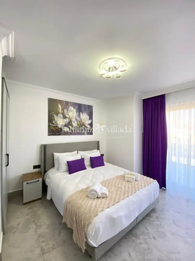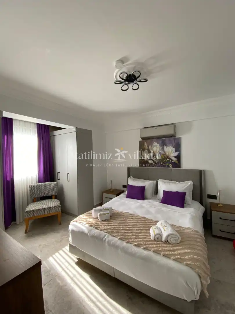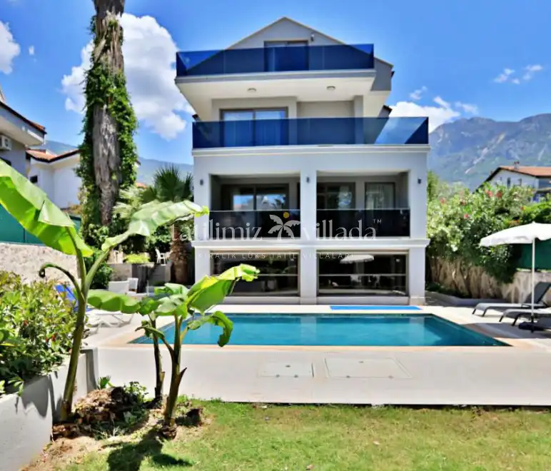 Geniş ve aydınlık salonu, tam donanımlı mutfağı ve konforlu yatak odaları sayesinde ev rahatlığında bir tatil deneyimi yaşatır. Villanın size ait özel yüzme havuzu ve güneşlenme alanı, tatil boyunca özgür ve keyifli vakit geçirmenize imkân sağlar. Bahçe alanında bulunan oturma grubu ve yemek masası ise akşam saatlerinde sevdiklerinizle birlikte hoş anlar yaşamanız için düşünülmüştür.