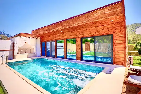 Havuz bahçe kısmı oldukça geniş olan villada, sıkılmadan uzun süre vakit geçirecek, sakinliğin keyfini sürebileceksiniz. Yemyeşil bahçesinde yer alan konforlu oturma grupları, oldukça modern locası ve salıncağı ile kapasiteye uygun şezlong takımıyla, villanın iç mekanı da dış mekanı kadar konforlu ve ferah bir yaşam alanı sunmaktadır. Kendi evinizi aratmayacak tüm araç gereçlere sahip olan villada, herhangi bir şeyin eksikliğini hissetmeniz söz konusu dahi olmayacak.