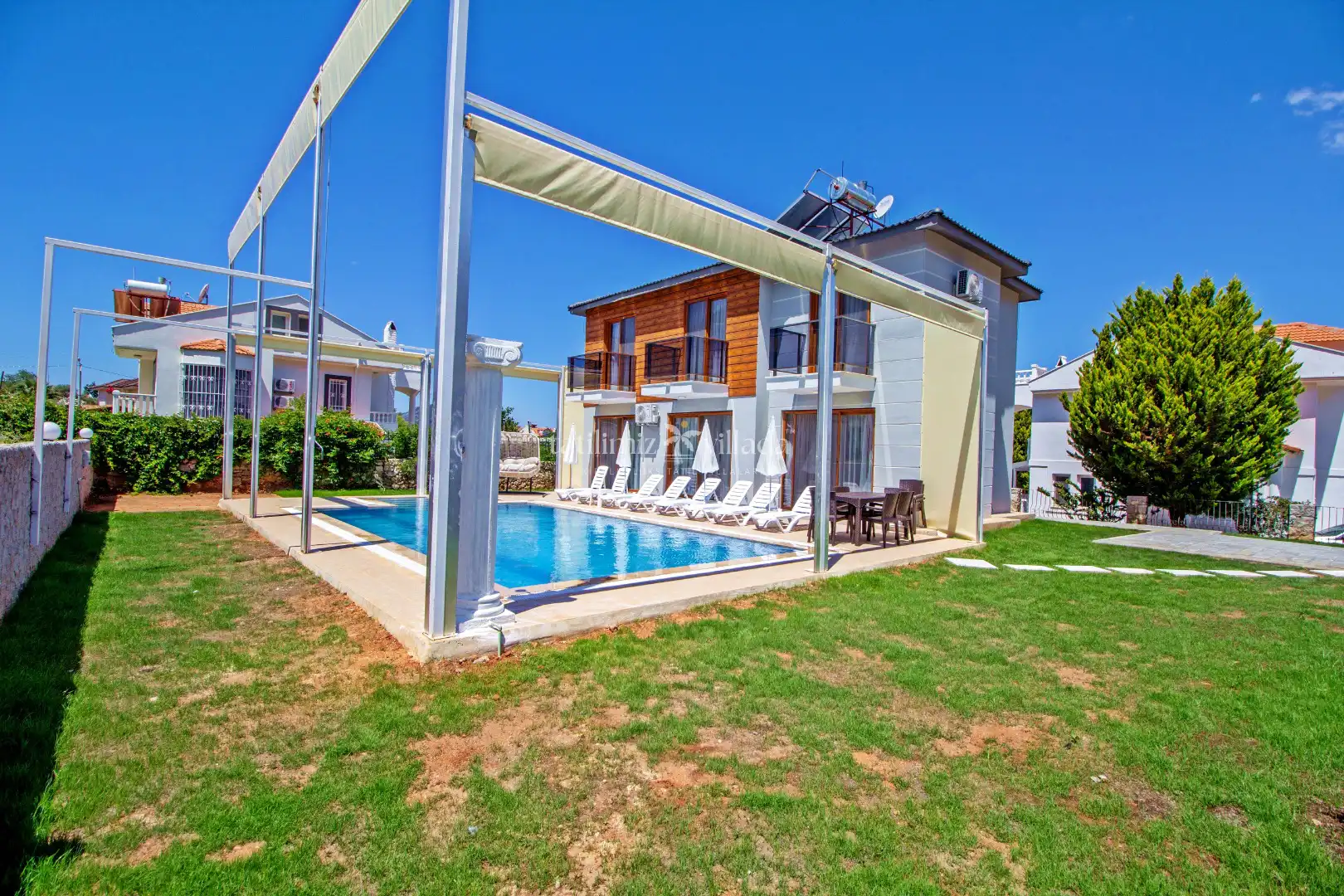Villanın dış alanı da en az içi kadar şık ve fonksiyoneldir. Korunaklı havuz ve gözlerden uzak havuz terası, tamamen özel bir tatil deneyimi sunmaktadır. Havuz, çevreden görünmeyen şekilde tasarlanmış olup, açılır kapanır branda sistemi ile korunaklıdır. Bu sayede dışarıdan hiçbir şekilde gözükmeden rahatça yüzebilir, güneşlenebilir ve dinlenebilirsiniz. Mahremiyetinize tam anlamıyla saygı gösterilen bu özel alan, tatilinizi tamamen özgür bir şekilde geçirmenizi sağlar. Ayrıca, geniş bahçe alanı, doğayla iç içe vakit geçirmek ve açık hava etkinlikleri düzenlemek için mükemmel bir ortam yaratmaktadır.