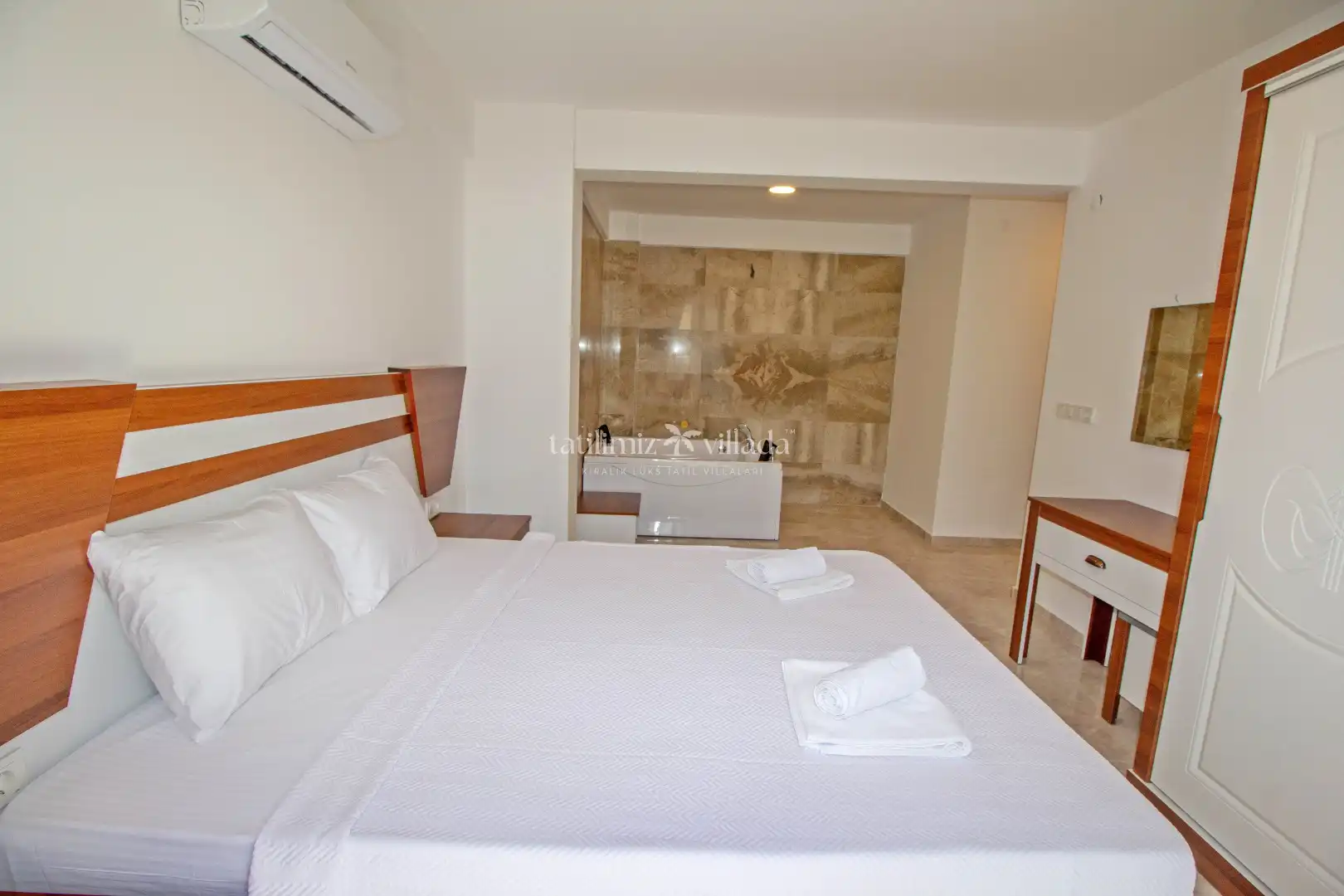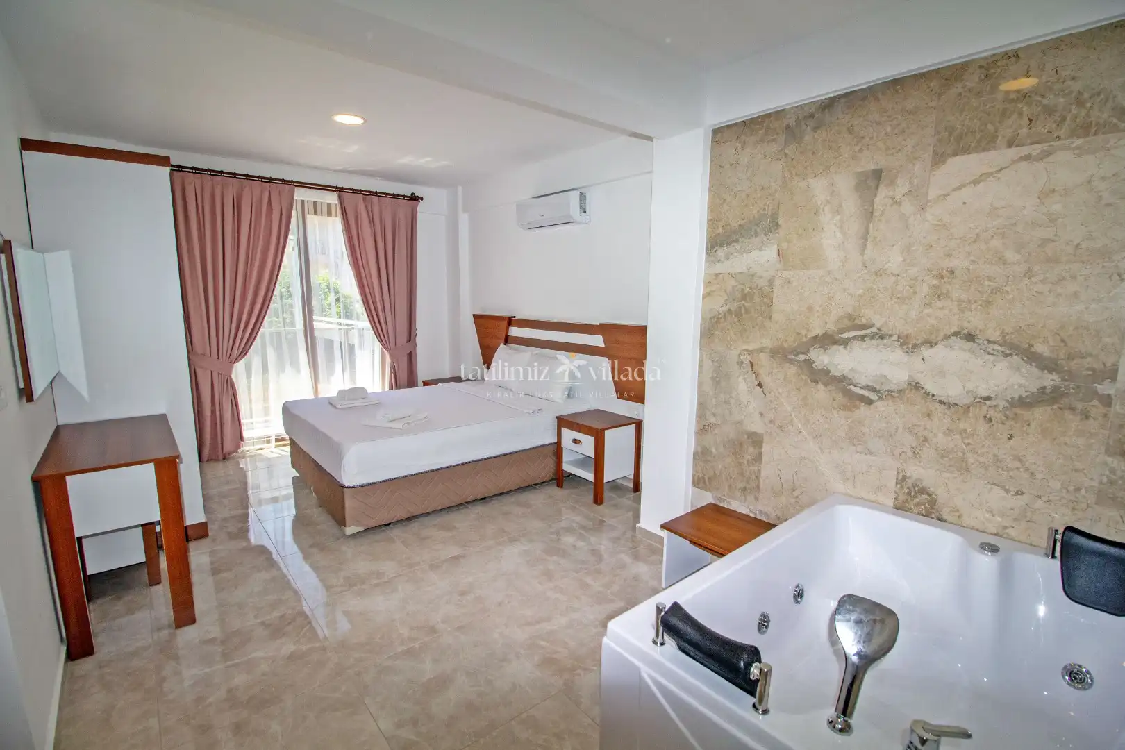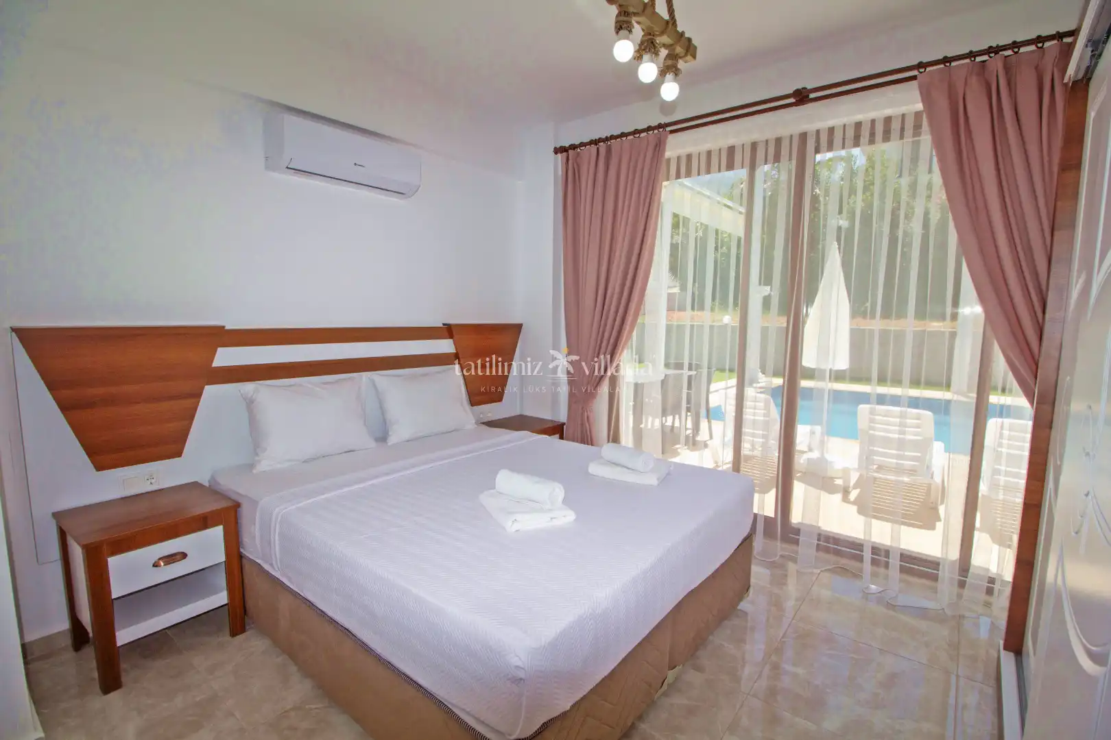 Toplamda 4 şık yatak odası bulunan villamızda, 8 kişiye kadar konaklama imkânı sunulmaktadır. Her bir yatak odası, modern tasarımı ve konforlu özellikleriyle tatilinizin her anını keyifli hale getirecek şekilde düzenlenmiştir. Geniş yaşam alanları, şık iç mekanlar ve kaliteli mobilyalar, villanın içindeki atmosferi son derece rahat ve estetik kılmaktadır. Aileler ve arkadaş grupları için oldukça uygun olan villa, her odasında yüksek konfor ve ferahlık sunarak misafirlerine lüks bir tatil deneyimi yaşatmaktadır. Ayrıca, tek katlı yapısı, her alana kolayca erişim sağlanmasını ve engelli misafirler ile çocuklu aileler için daha pratik bir kullanım imkânı tanımaktadır.