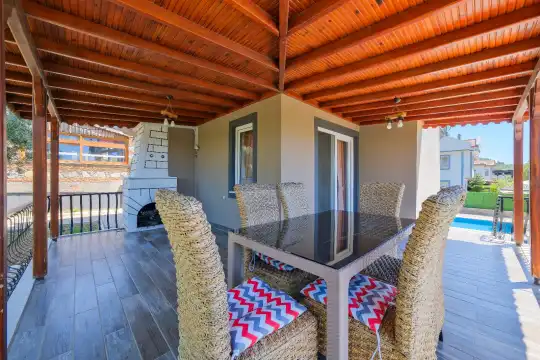 Villanın iç mekanında, şıklık ve konfor ön planda tutulmuş olup, her oda özenle dekore edilmiştir. Geniş ve ferah salon, rahat oturma alanları, büyük pencereler ve doğaya açılan manzaralar, misafirlerine dinlendirici bir ortam sağlar. Açık plan mutfak ve yemek alanı ise tatilinizi daha da pratik hale getirecek şekilde tasarlanmıştır.