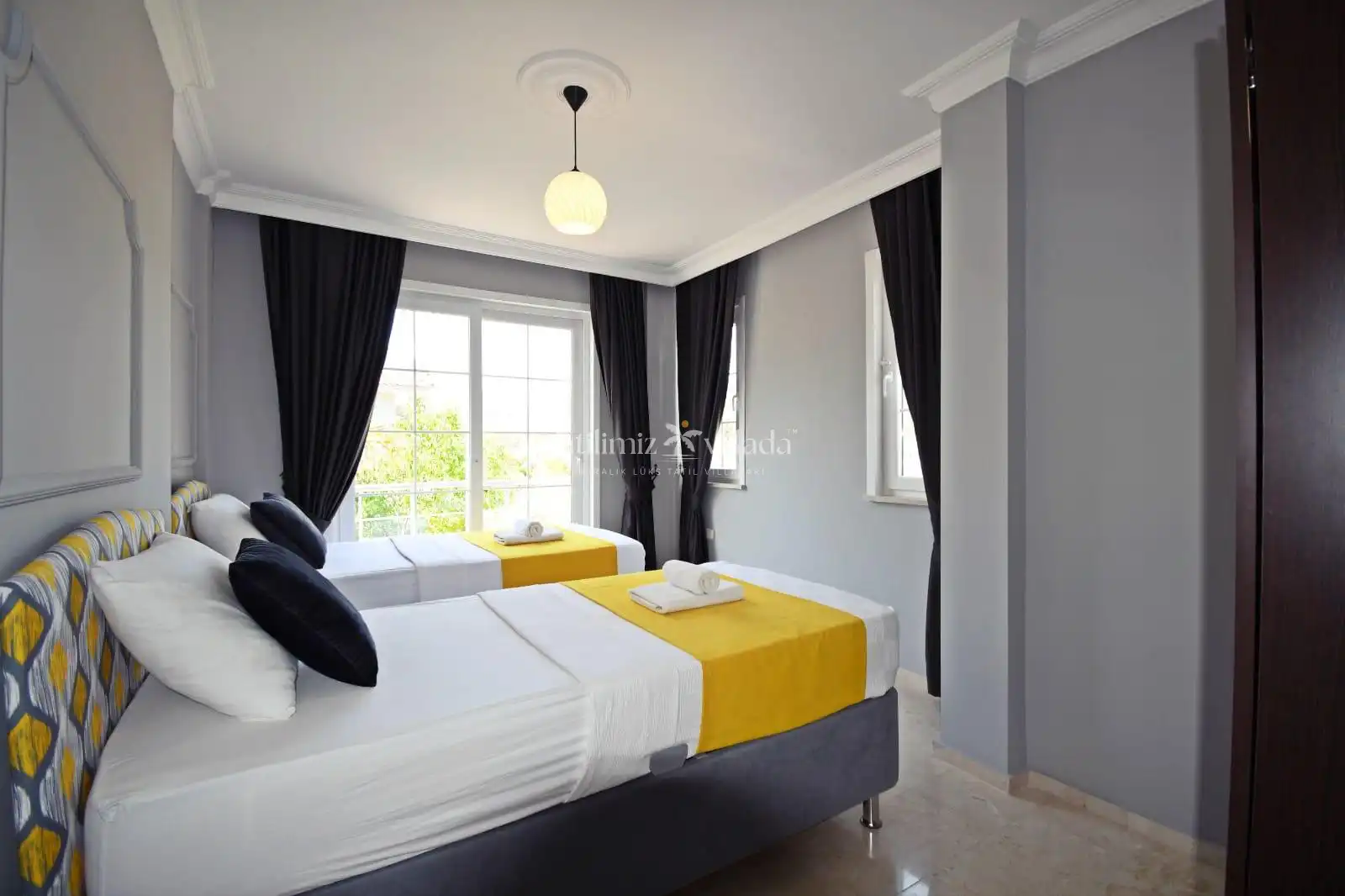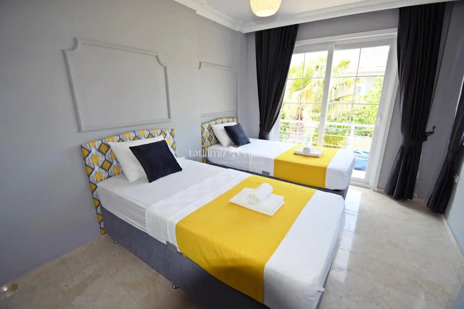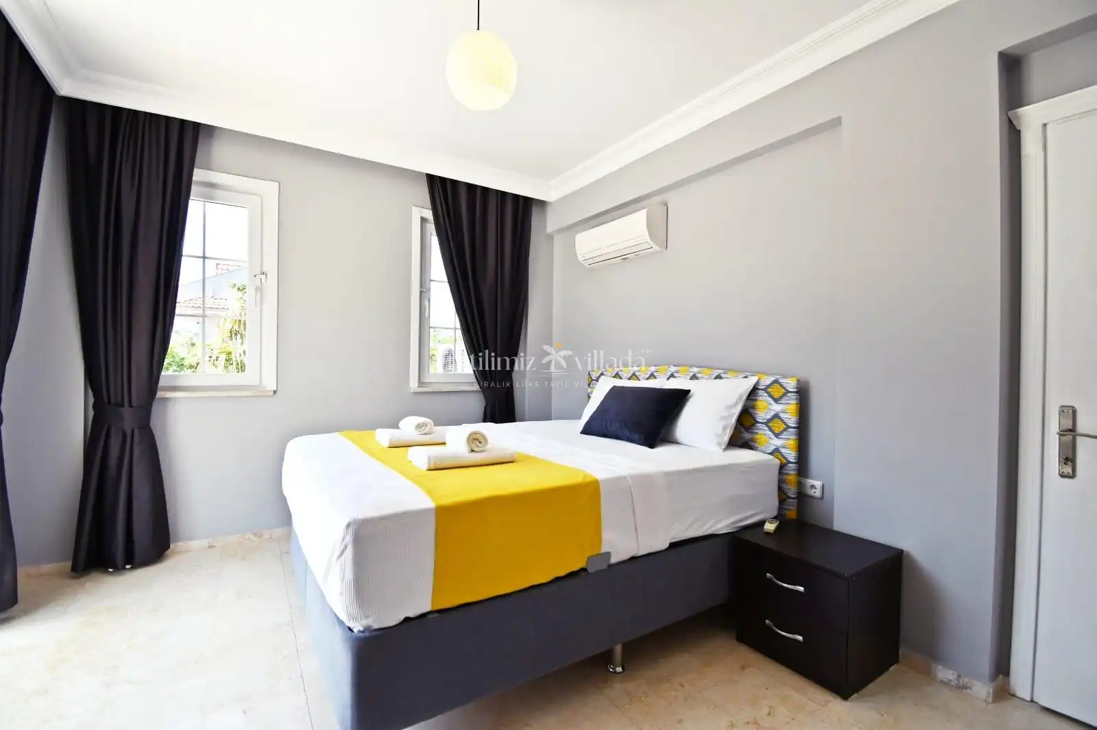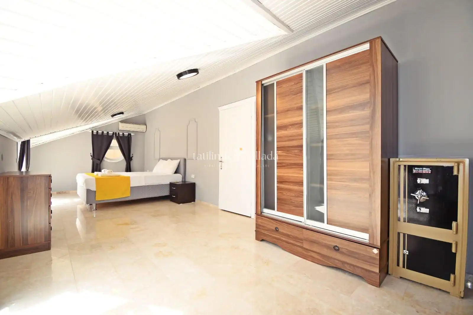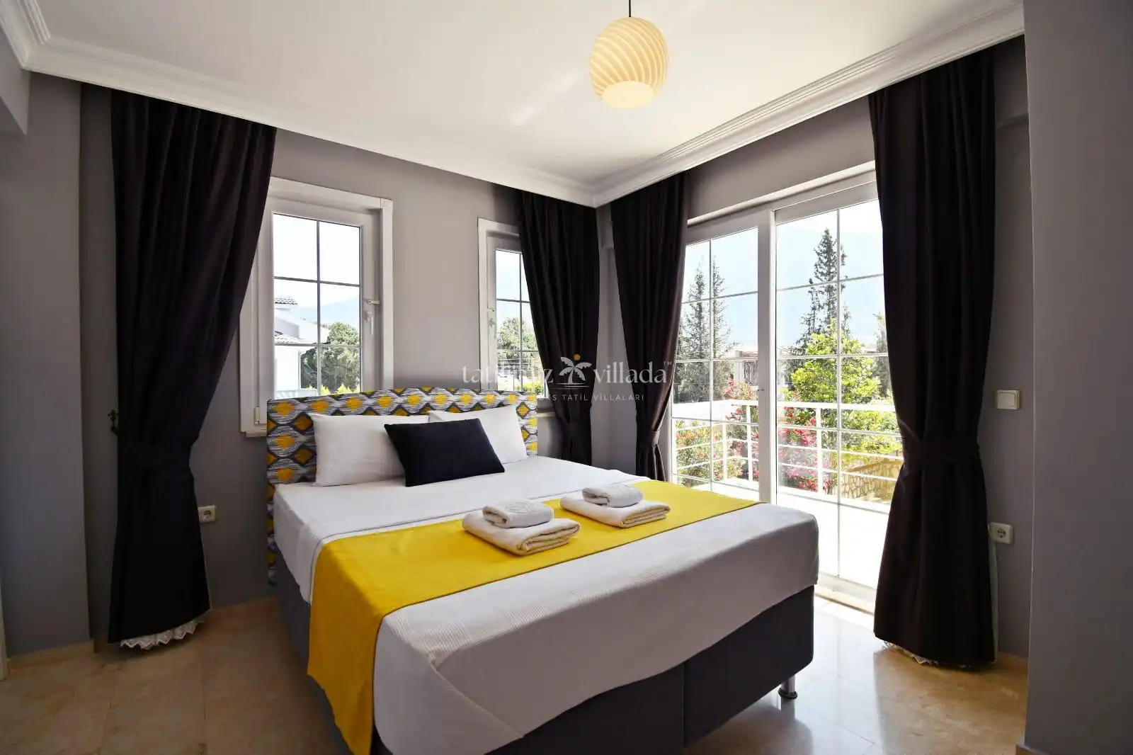 Villa içerisinde yer alan master yatak odasında bulunan banyoda çift jakuzi detayı, villaya lüks bir dokunuş katmaktadır. Günün yorgunluğunu atmak, tatili biraz daha keyifli ve özel hale getirmek isteyen misafirler için bu alan gerçek bir ayrıcalık sunar. Diğer yatak odaları da ferah yapısı ve konforlu düzeniyle kalabalık konaklamalarda rahat bir kullanım sağlar.