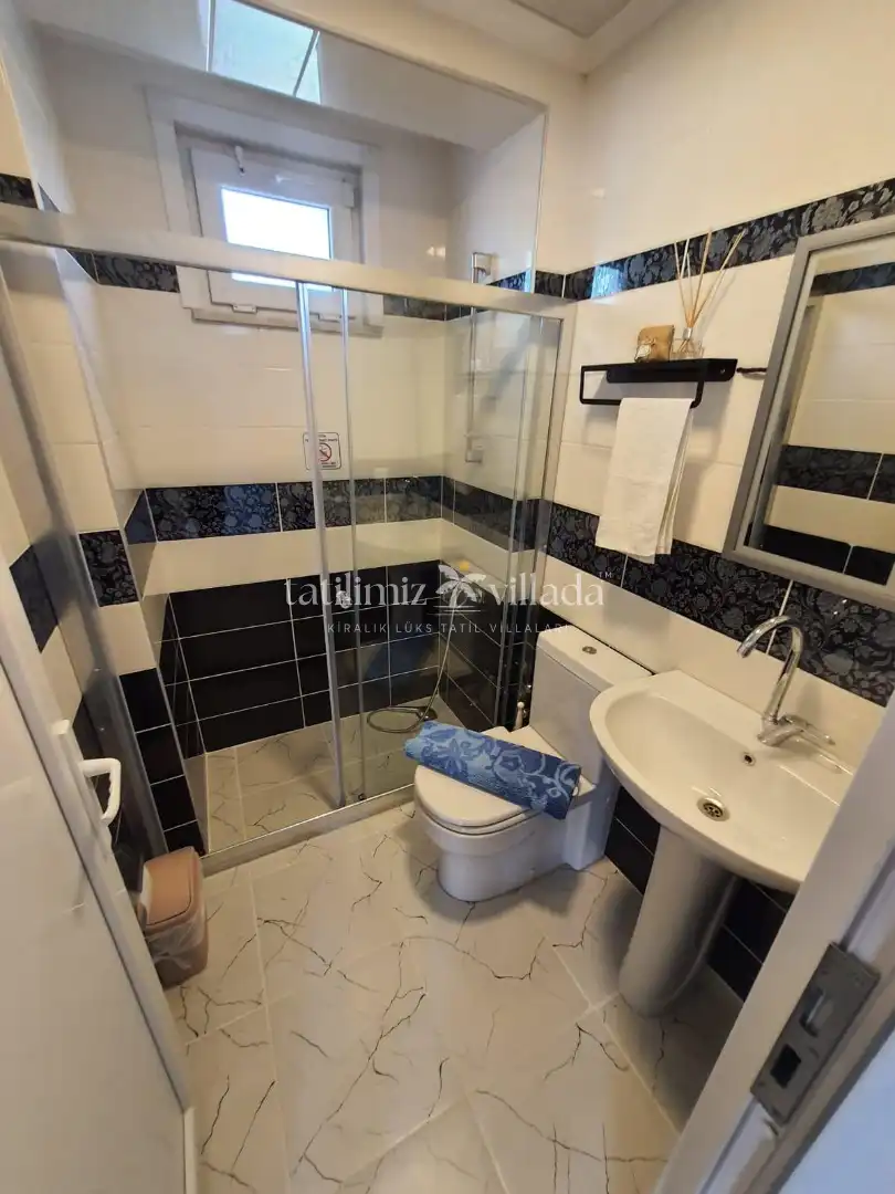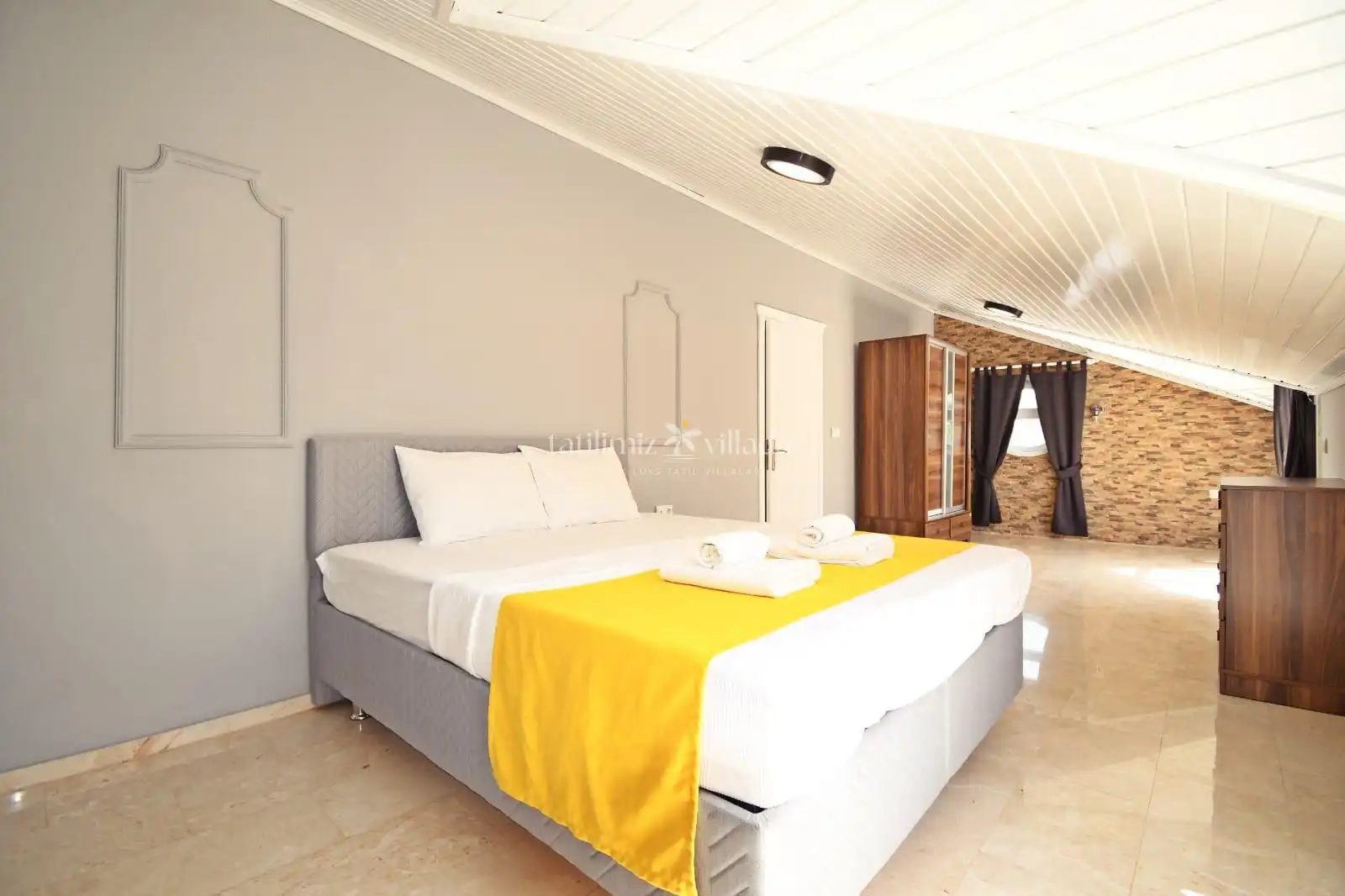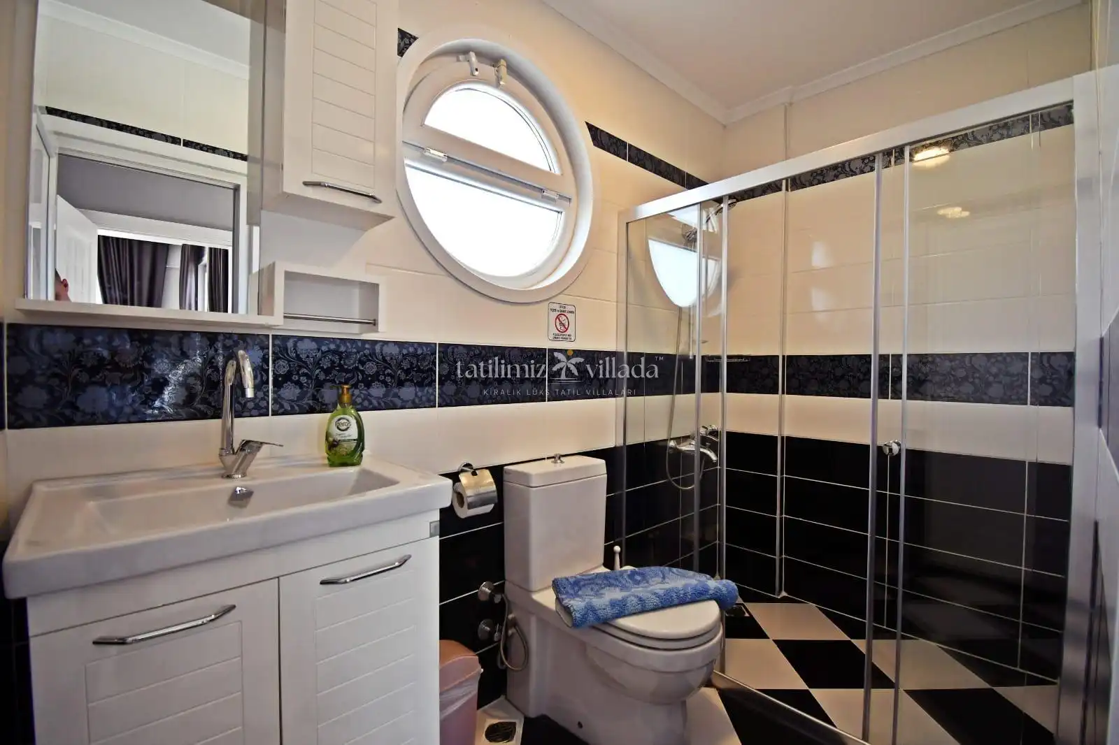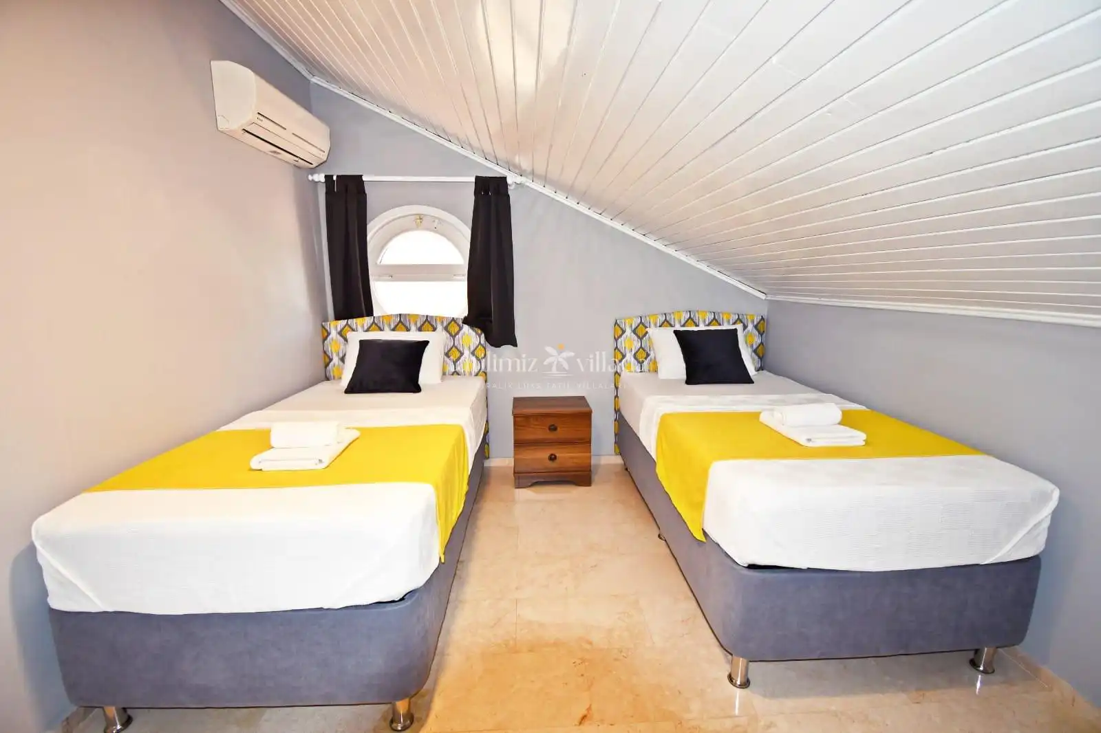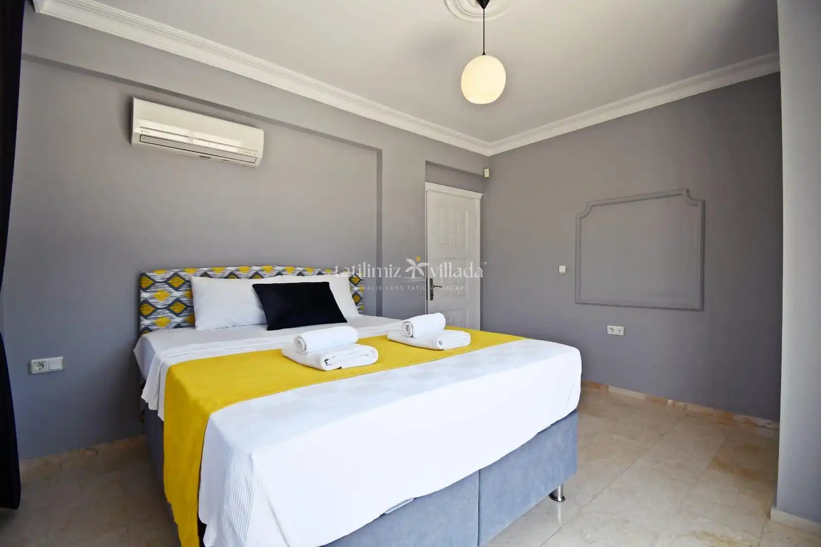 Villa içerisinde yer alan master yatak odasında bulunan banyoda çift jakuzi detayı, villaya lüks bir dokunuş katmaktadır. Günün yorgunluğunu atmak, tatili biraz daha keyifli ve özel hale getirmek isteyen misafirler için bu alan gerçek bir ayrıcalık sunar. Diğer yatak odaları da ferah yapısı ve konforlu düzeniyle kalabalık konaklamalarda rahat bir kullanım sağlar.