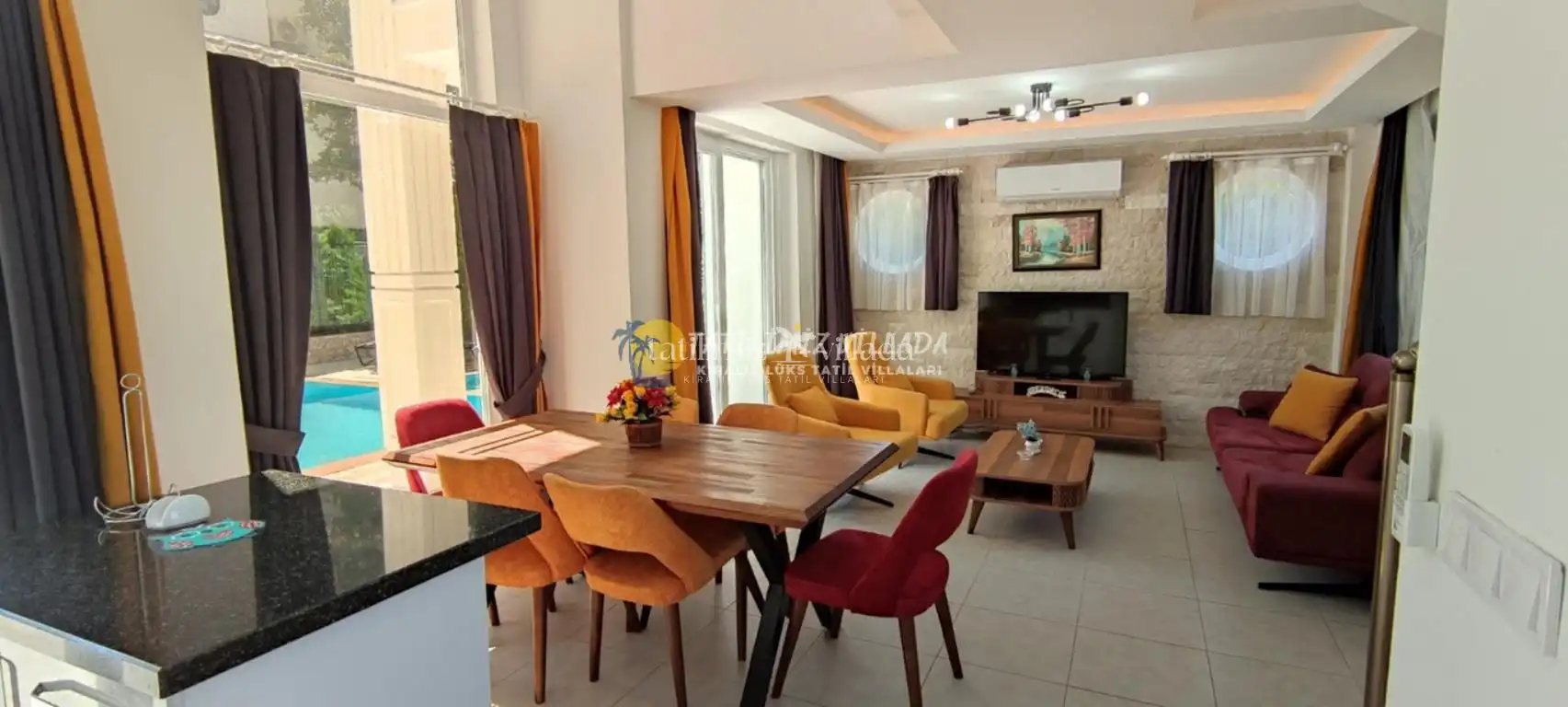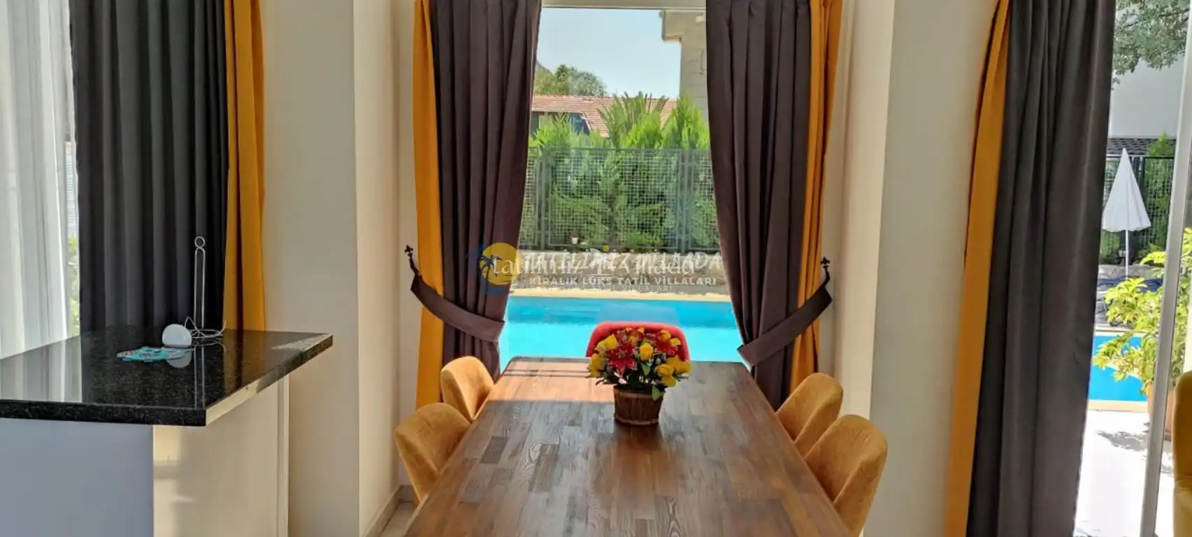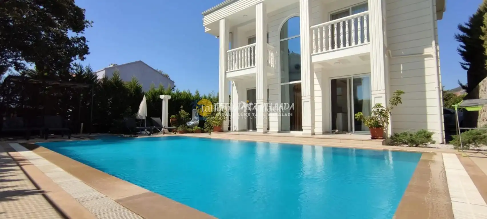 Geniş bahçe alanı ve şezlonglarla donatılmış havuz terası, gün boyu dinlenmek, güneşlenmek ve ailenizle birlikte keyifli anlar geçirmek için idealdir. Villanın modern mutfak ve yemek alanı, tatiliniz boyunca yemek hazırlığınızı rahatça yapabilmenizi sağlar.