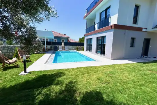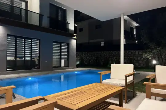 Bahçesinde özel yüzme havuzu, şezlonglar, güneşlenme alanı ve keyifli bir veranda alanı yer alır. Havuz başında barbekü yapabilir, gün boyu güneşin ve doğanın tadını çıkarabilirsiniz.