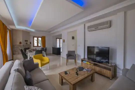 Açık plan oturma odasında geniş ve rahat koltuklar, büyük ekran televizyon ve bir dinlenme alanı yer almaktadır. Aynı zamanda, modern bir mutfak ve geniş yemek alanı da villa içinde yer almaktadır. Yüksek kaliteli mutfak aletleri ve geniş çalışma alanı, yemek hazırlamayı daha eğlenceli ve pratik hale getirir. Ayrıca, villada yer alan geniş yemek masası, akşam yemeklerinizi keyifli bir ortamda yiyebilmeniz için idealdir. İç mekan tasarımı, hem şıklığı hem de fonksiyonelliği bir araya getirerek her yaş grubundan misafire hitap etmektedir.