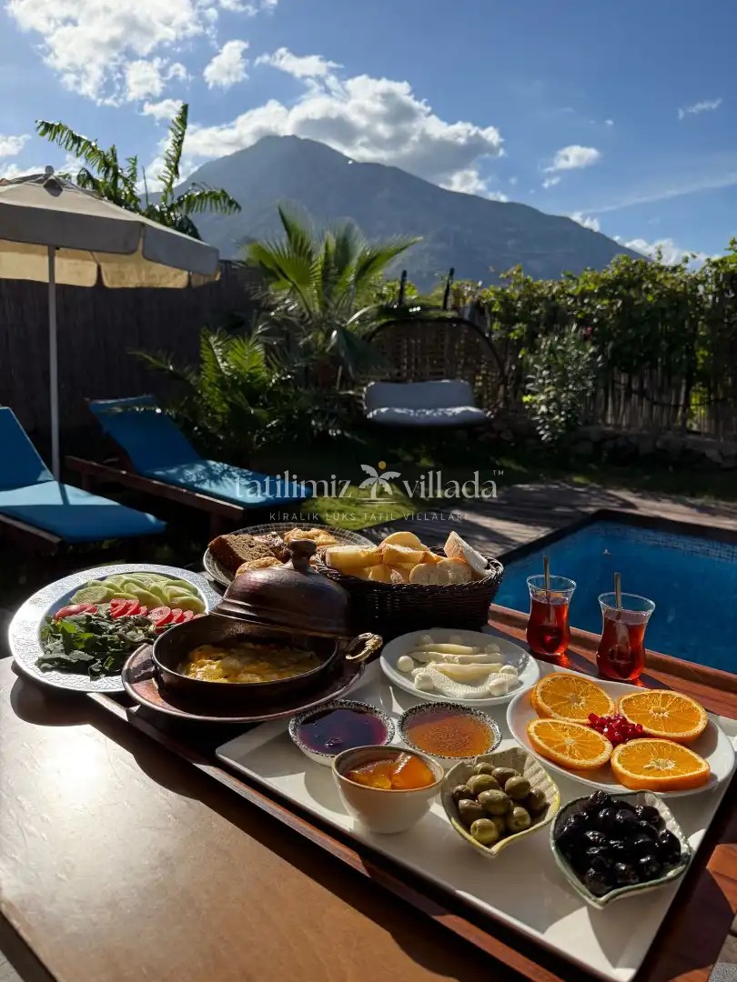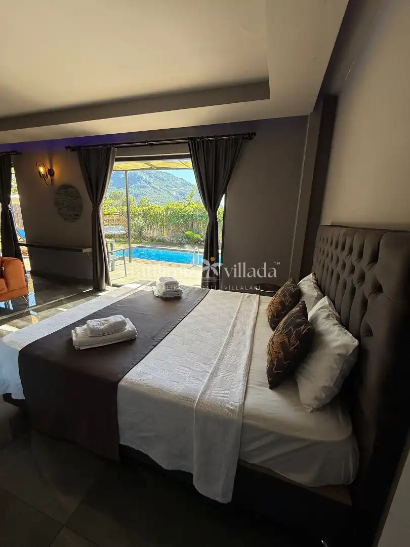 Villada korunaklı özel yüzme havuzu, şezlonglar, şemsiye, mangal alanı, bahçe salıncağı ve duş alanı bulunmaktadır. Modern tasarımlı suite salonda king/oval yatak, oturma grubu, klima, LCD TV ve salondan direkt havuza çıkış imkânı mevcuttur.