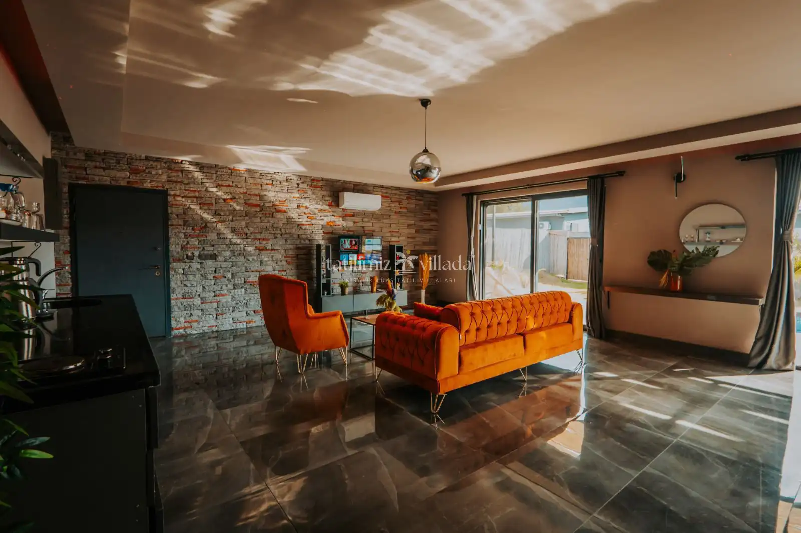 Villada korunaklı özel yüzme havuzu, şezlonglar, şemsiye, mangal alanı, bahçe salıncağı ve duş alanı bulunmaktadır. Modern tasarımlı suite salonda king/oval yatak, oturma grubu, klima, LCD TV ve salondan direkt havuza çıkış imkânı mevcuttur.