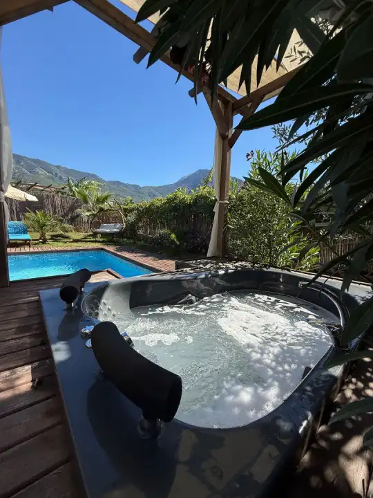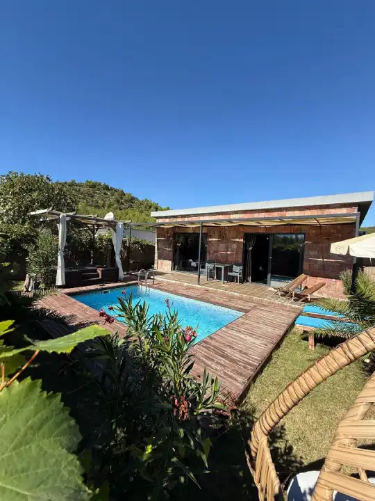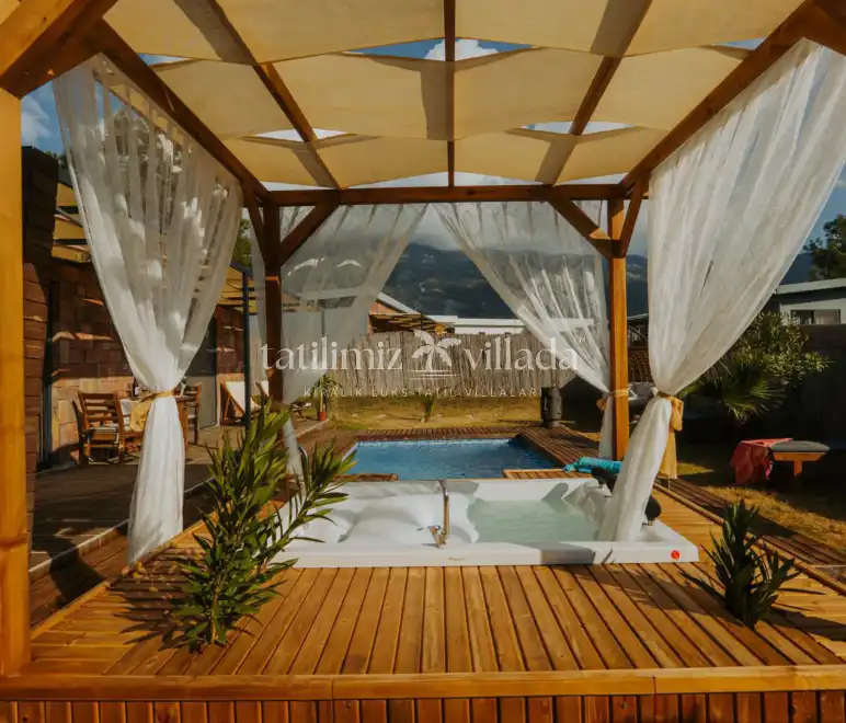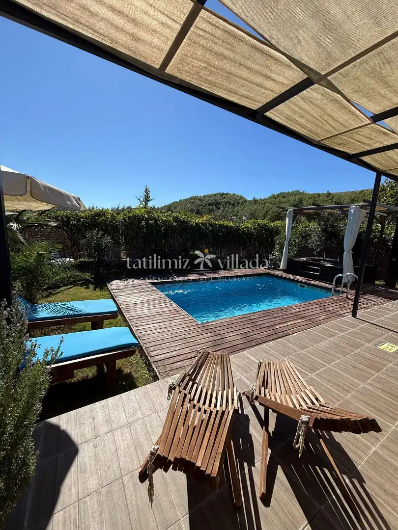 Villada korunaklı özel yüzme havuzu, şezlonglar, şemsiye, mangal alanı, bahçe salıncağı ve duş alanı bulunmaktadır. Modern tasarımlı suite salonda king/oval yatak, oturma grubu, klima, LCD TV ve salondan direkt havuza çıkış imkânı mevcuttur.