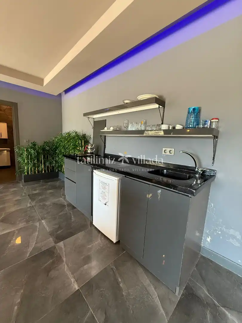 Açık plan mutfakta bulaşık makinesi, ocak, buzdolabı, kettle ve tüm temel mutfak ekipmanları yer almaktadır. Villamız maksimum 2 kişi kapasitelidir ve balayı çiftleri için oldukça uygundur.
