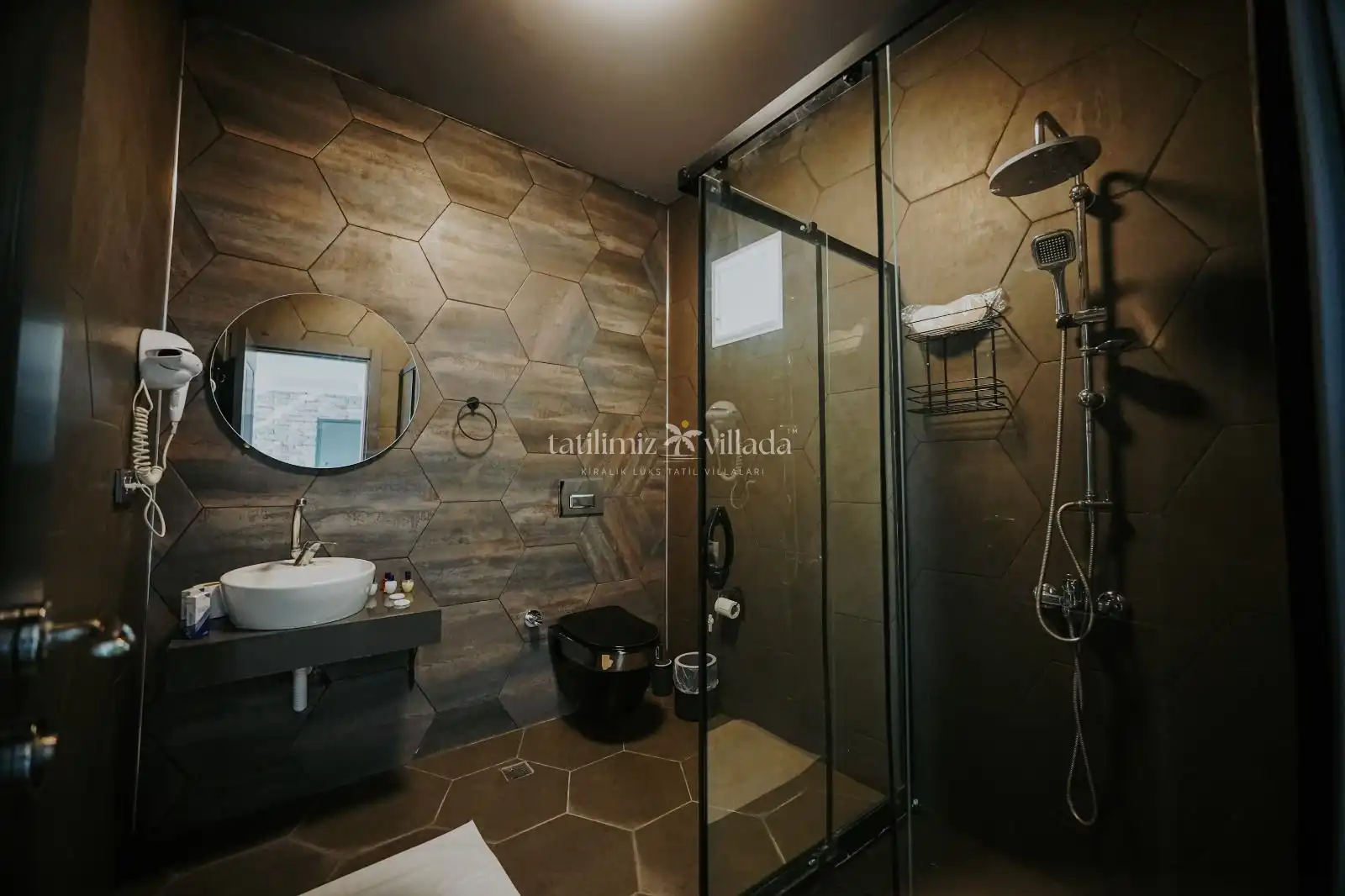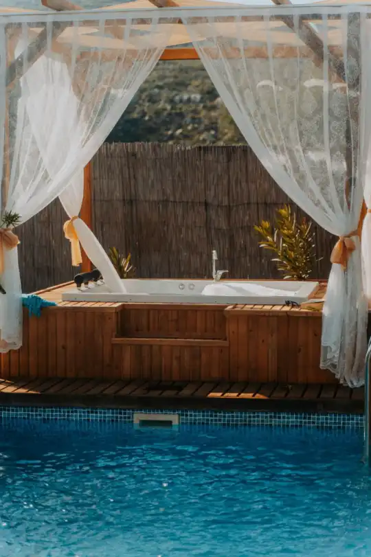 Villada korunaklı özel yüzme havuzu, şezlonglar, şemsiye, mangal alanı, bahçe salıncağı ve duş alanı bulunmaktadır. Modern tasarımlı suite salonda king/oval yatak, oturma grubu, klima, LCD TV ve salondan direkt havuza çıkış imkânı mevcuttur.