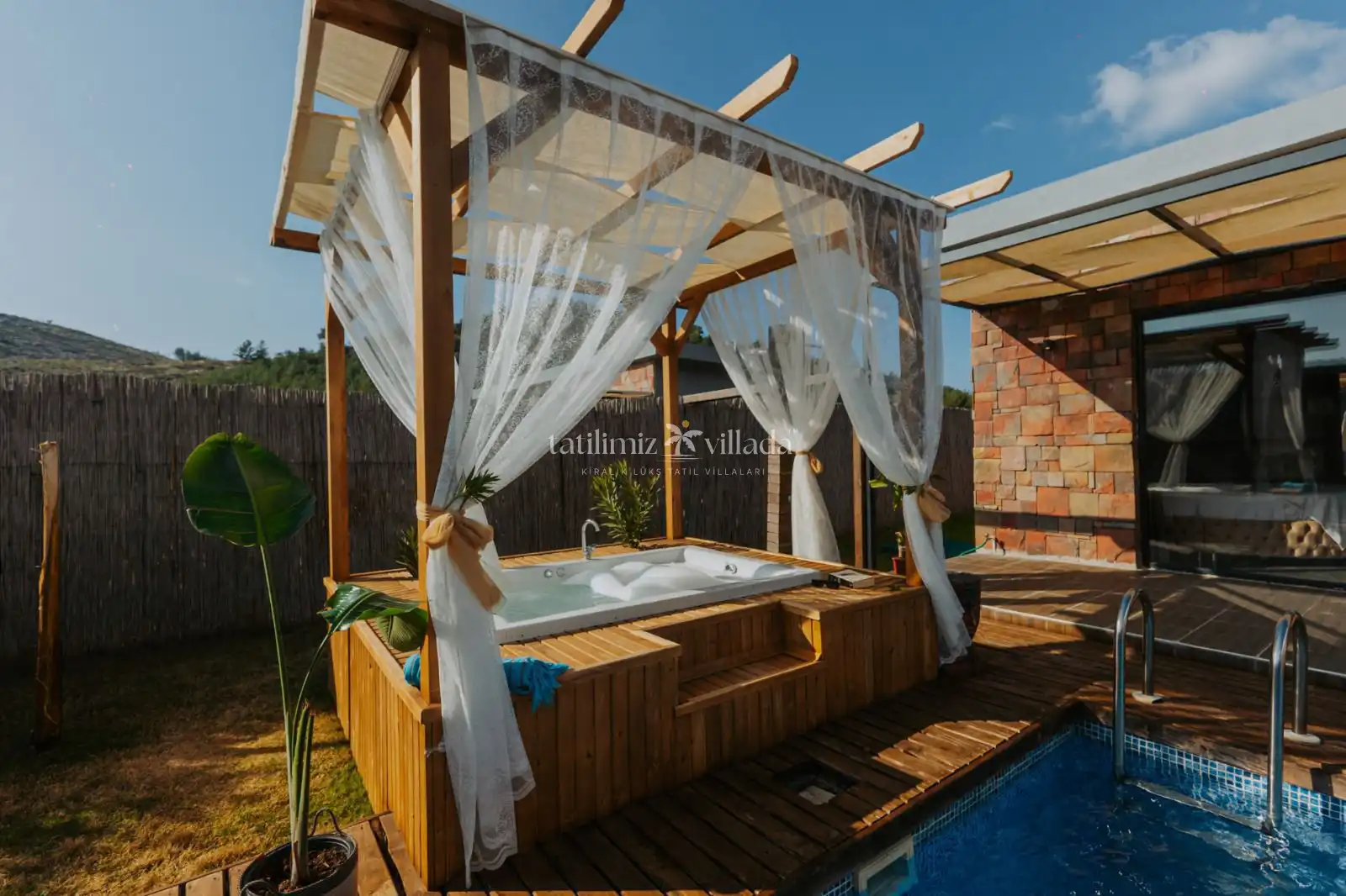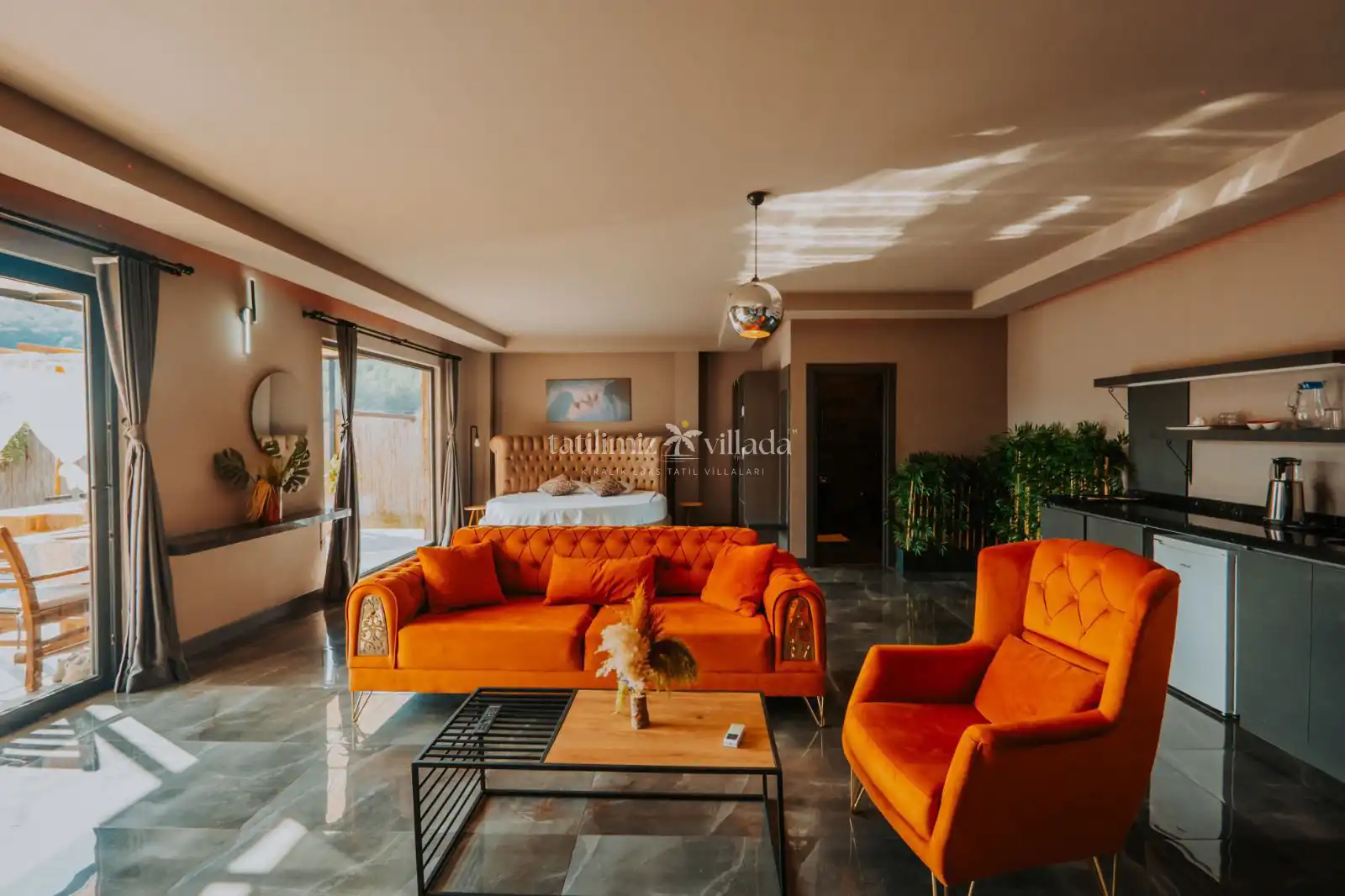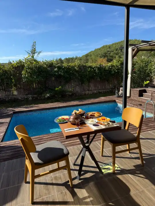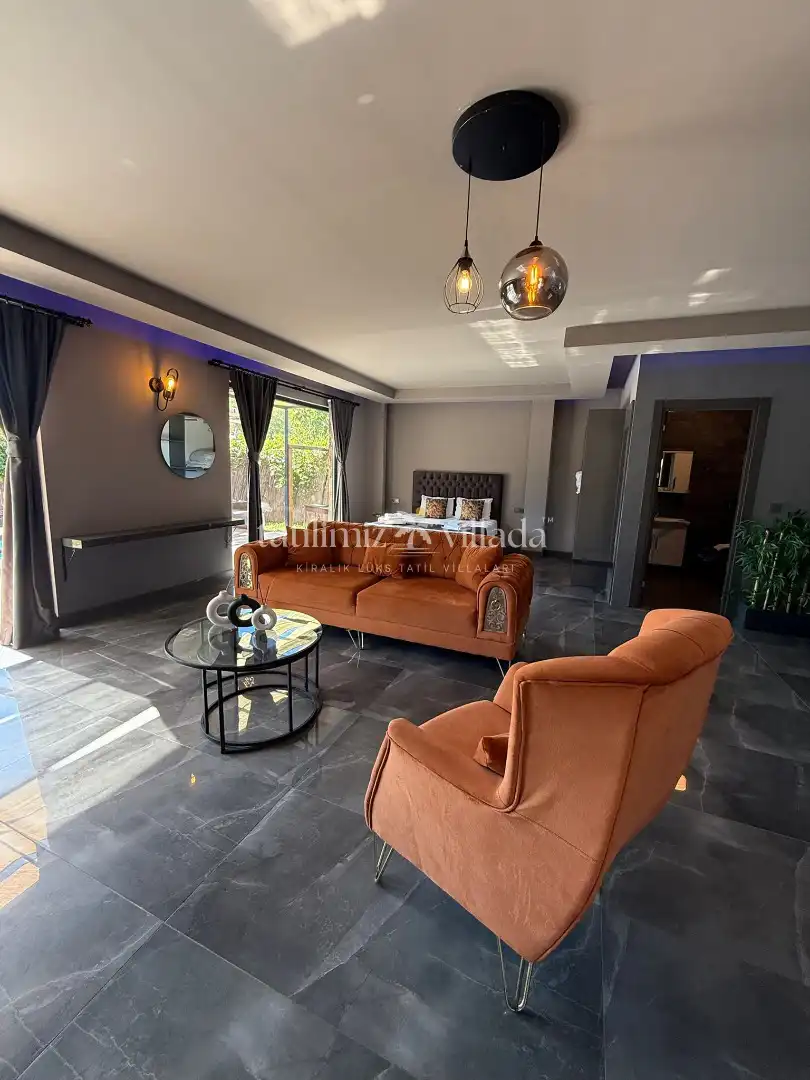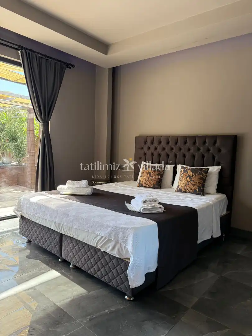 Villada korunaklı özel yüzme havuzu, şezlonglar, şemsiye, mangal alanı, bahçe salıncağı ve duş alanı bulunmaktadır. Modern tasarımlı suite salonda king/oval yatak, oturma grubu, klima, LCD TV ve salondan direkt havuza çıkış imkânı mevcuttur.