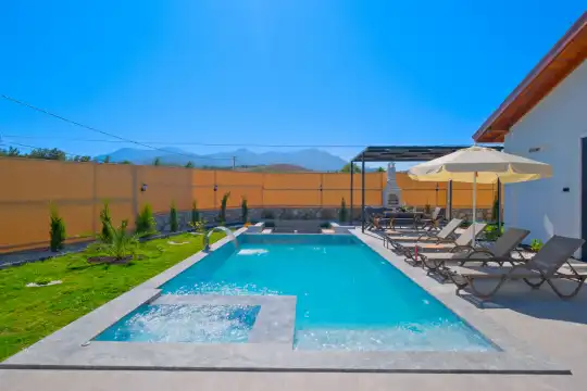 Ayrıca villada bulunan jakuzili havuz, çocuk havuzu olarak da kullanılabilmektedir. Bu özelliği sayesinde hem yetişkinler hem de çocuklar için konforlu ve eğlenceli bir tatil ortamı sunulmaktadır. Korunaklı havuz alanı sayesinde misafirler daha özel ve rahat bir tatil deneyimi yaşayabilmektedir.