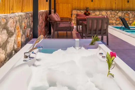 Villamızın iç mekânı modern ve konforlu bir şekilde dizayn edilmiş olup, tüm ihtiyaçlarınızı karşılayacak donanıma sahiptir. Geniş ve ferah salonu, tam donanımlı mutfağı ve şık mobilyalarıyla ev konforunda bir tatil imkânı sunar. İki ayrı yatak odası bulunan villada bir oda ebeveyn banyolu olup, ayrıca özel jakuzi ile donatılmıştır. Bu sayede günün yorgunluğunu üzerinizden atabilir, doğayla iç içe huzurlu anlar yaşayabilirsiniz.