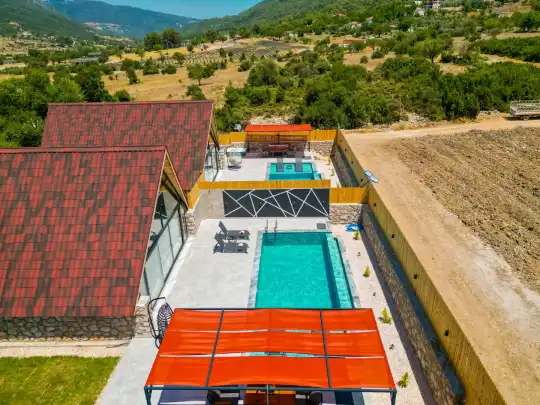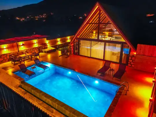 Villamızın iç mekânı modern ve konforlu bir şekilde dizayn edilmiş olup, tüm ihtiyaçlarınızı karşılayacak donanıma sahiptir. Geniş ve ferah salonu, tam donanımlı mutfağı ve şık mobilyalarıyla ev konforunda bir tatil imkânı sunar. İki ayrı yatak odası bulunan villada bir oda ebeveyn banyolu olup, ayrıca özel jakuzi ile donatılmıştır. Bu sayede günün yorgunluğunu üzerinizden atabilir, doğayla iç içe huzurlu anlar yaşayabilirsiniz.