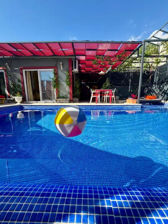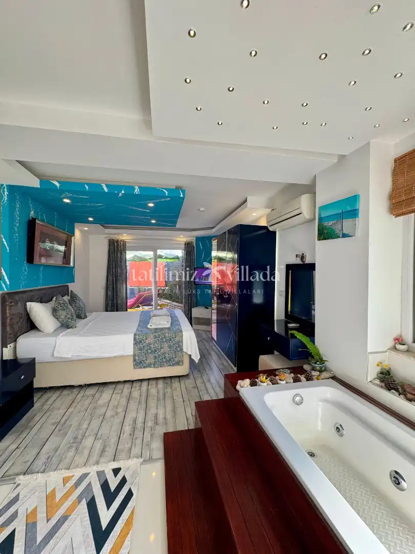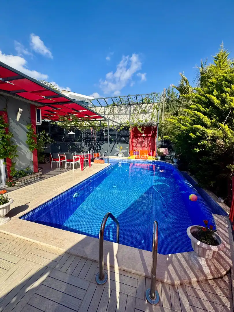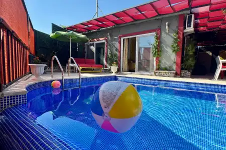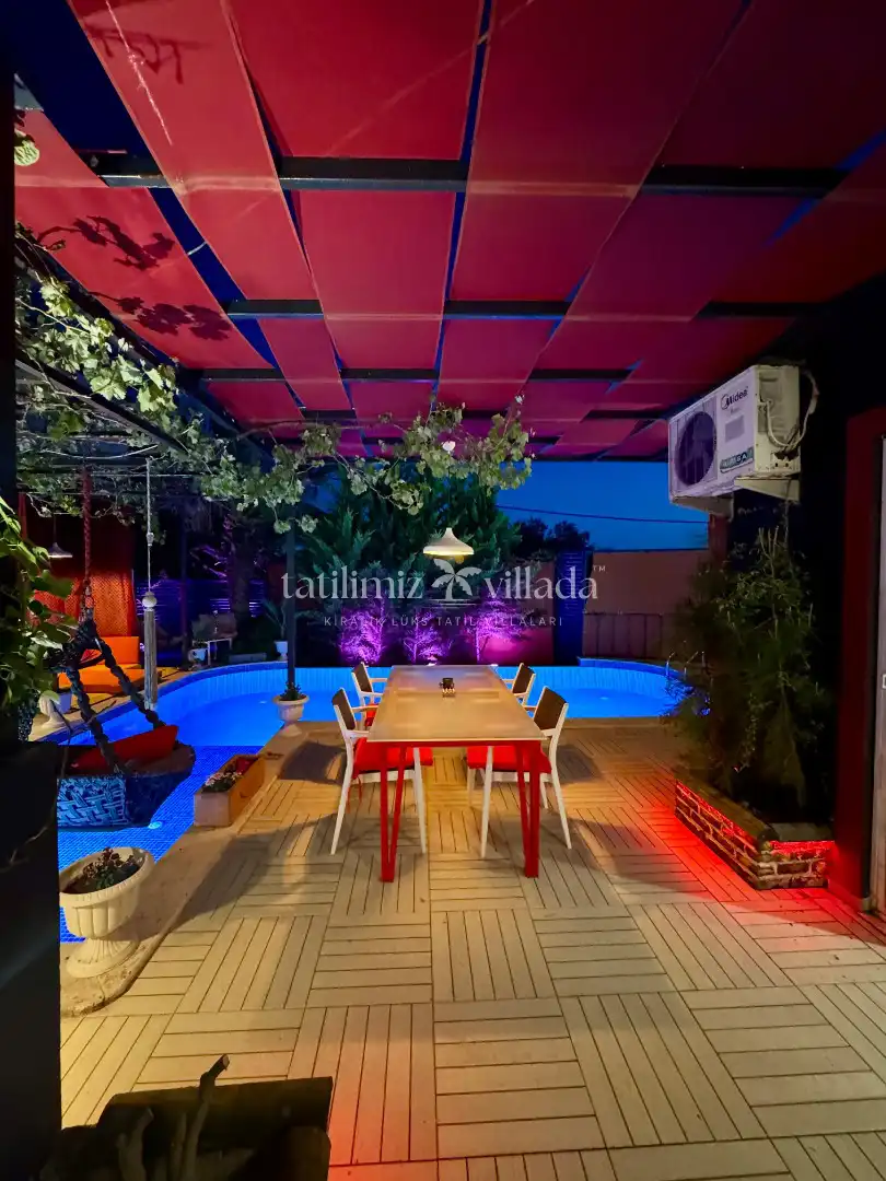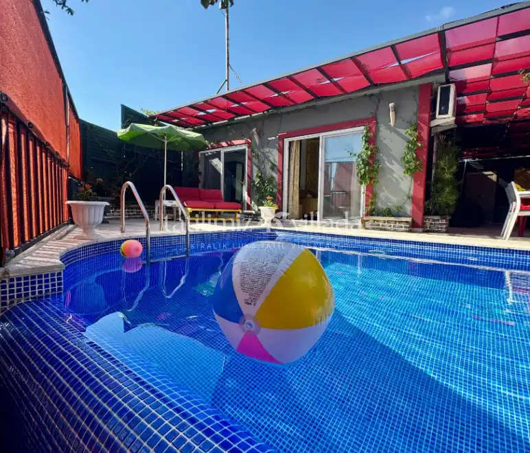 Özel yüzme havuzu dışarıdan görünmeyecek şekilde korunaklıdır. Bu özelliği sayesinde gözlerden uzak konforlu bir tatil sunan bir korunaklı kiralık villa alternatifidir. Havuz alanında 3 m x 2 m ölçülerinde ve 25 cm derinliğinde sığ havuz bölümü de bulunmaktadır.