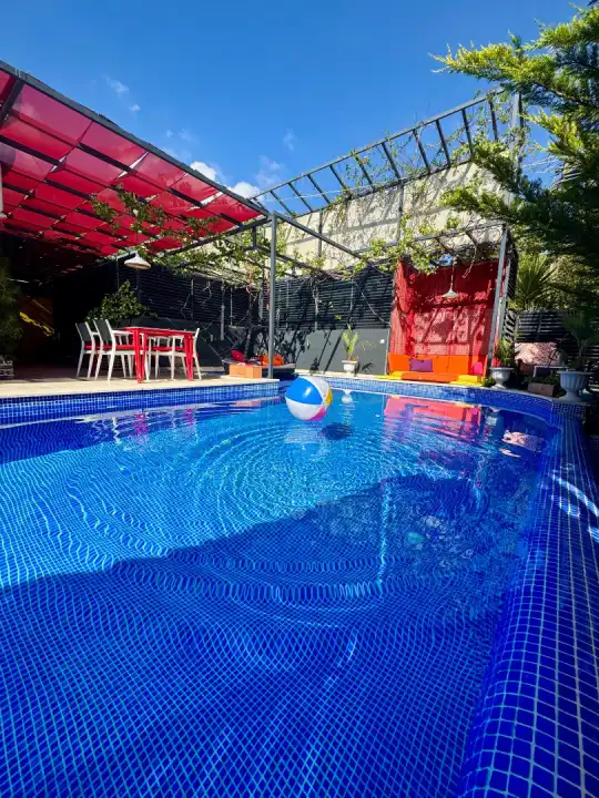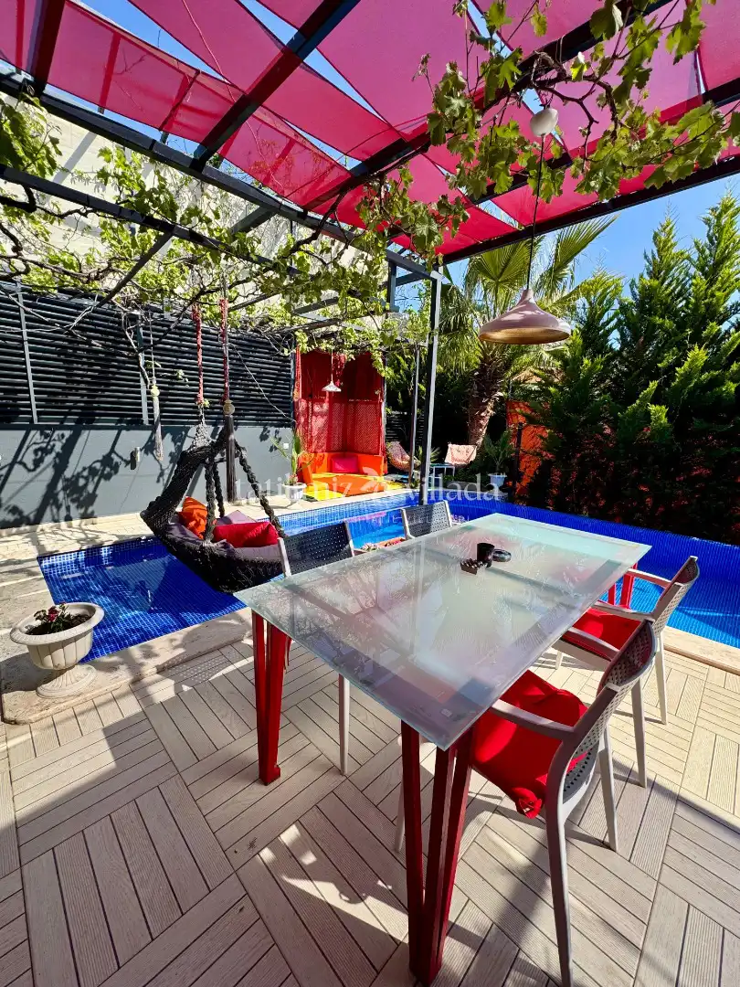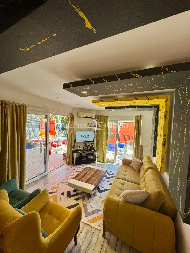 Renkli ve modern tasarımı, şemsiyelerle dekore edilmiş bahçe alanı ve sakin konumu ile Villa Rixs 1, huzurlu bir Kalkan kiralık villa tatili geçirmek isteyen misafirler için ideal bir tercihtir.