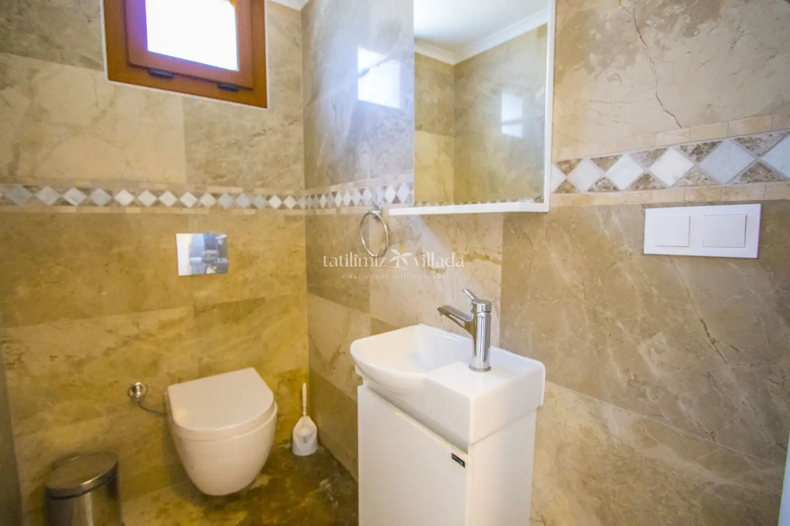 Dış mekanında ise, özel yüzme havuzu ve bahçe alanları sayesinde, sevdiklerinizle birlikte keyifli zamanlar geçirebilir, güneşlenebilir veya akşam yemeğinizi dışarıda yiyebilirsiniz. Villa, aynı zamanda doğal yaşam alanları ve bahçe düzenlemesiyle sakin bir atmosfer sunar. Barbekü alanı da tatilinizin eğlenceli anlarına katkı sağlar, sevdiklerinizle birlikte açık havada lezzetli yemekler hazırlayabilir ve güzel akşamlar geçirebilirsiniz.