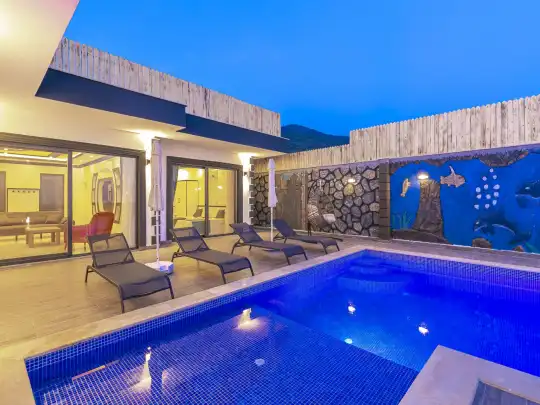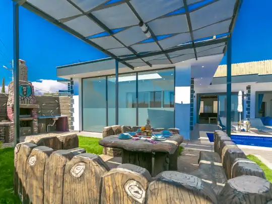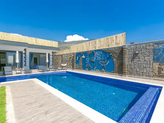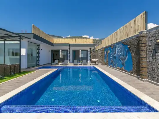 Villanın dış alanı da en az iç mekânı kadar özenlidir. Bahçesinde yer alan özel yüzme havuzu, şezlonglar ve oturma alanları sayesinde gününüzü dış mekânda dinlenerek geçirebilir, akşamları ise doğanın içinde sevdiklerinizle birlikte keyifli anlar yaşayabilirsiniz. Şehrin gürültüsünden uzak, sadece doğanın sesini duyabileceğiniz bu özel villada, tatilinizi tamamen size ait bir alanda geçirme ayrıcalığını yaşayacaksınız.