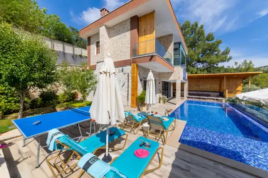 Villamızın zemin katında, tam donanımlı mutfak ve geniş bir salon bulunmaktadır. 1. katta ise iki yatak odası yer almaktadır. Yatak odalarından birinde jakuzili ve ısıtmalı kapalı havuz bulunmakta, misafirlerimize dört mevsim boyunca konforlu bir tatil imkanı sunmaktadır. Ayrıca, jakuzide rahatlayıp, havuzun keyfini çıkarabileceğiniz bu özel alan, balayı çiftleri ve huzurlu bir tatil isteyenler için mükemmel bir ortam yaratmaktadır.