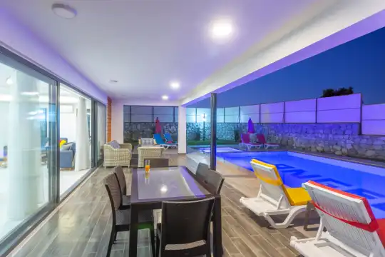 Villanın özel yüzme havuzu ve geniş güneşlenme terası, gün boyu dilediğiniz gibi serinleyip güneşin tadını çıkarabileceğiniz bir ortam sunar. Havuz başında keyifli vakit geçirebilir, bahçesinde sevdiklerinizle huzurlu anlar yaşayabilirsiniz. Villanın kullanım kolaylığı sağlayan düzeni, tatilinizi daha rahat ve keyifli hale getirir.