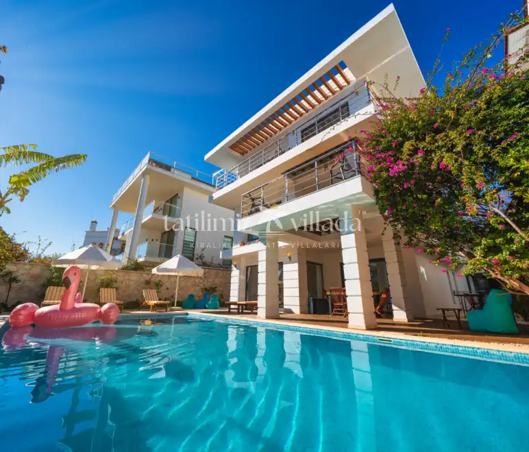Villa Simena, Kalkan Merkez mevkiinde yer alan 4+1 konforlu yapısıyla geniş aileler ve kalabalık arkadaş grupları için ideal bir konaklama seçeneğidir. Modern mimarisi, ferah kullanım alanları ve deniz manzarasını her an hissedebileceğiniz konumu sayesinde misafirlerine keyifli bir tatil deneyimi sunmaktadır. Villanın içerisinde dört adet yatak odası, geniş bir salon, tam donanımlı mutfak ve misafirlerin tüm ihtiyaçlarına cevap verebilecek ekipmanlar bulunmaktadır. Özenle tasarlanmış iç mekanların yanı sıra dış alanda yer alan özel yüzme havuzu, dinlenme köşeleri ve güneşlenme alanı tatilinizi daha da keyifli hale getirir. Villanın en dikkat çekici özelliklerinden biri ise jakuzisidir; günün yorgunluğunu atmak ve manzaranın tadını çıkarmak isteyen misafirler için ideal bir ayrıcalık sunar. Kalkan Merkez’e yürüme mesafesinde olması sayesinde restoranlara, marketlere, plajlara ve sosyal aktivitelere kolayca ulaşabilir, tatiliniz boyunca aracınızı sık sık kullanma ihtiyacı duymadan rahatlıkla bölgeyi keşfedebilirsiniz. Villa Simena, hem konforu hem de merkezi konumu bir arada sunarak misafirlerine huzurlu, keyifli ve unutulmaz bir tatil deneyimi vaat etmektedir.