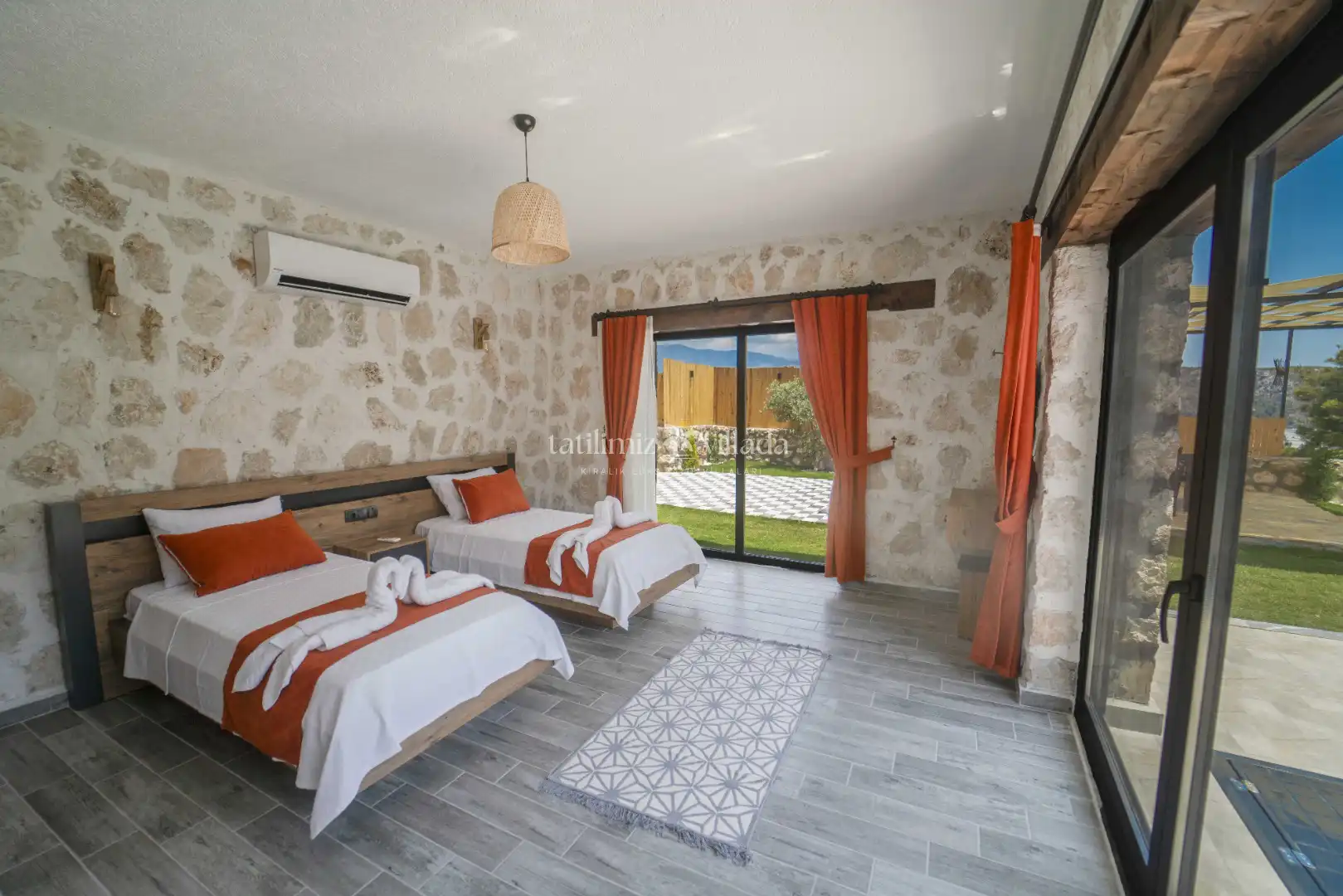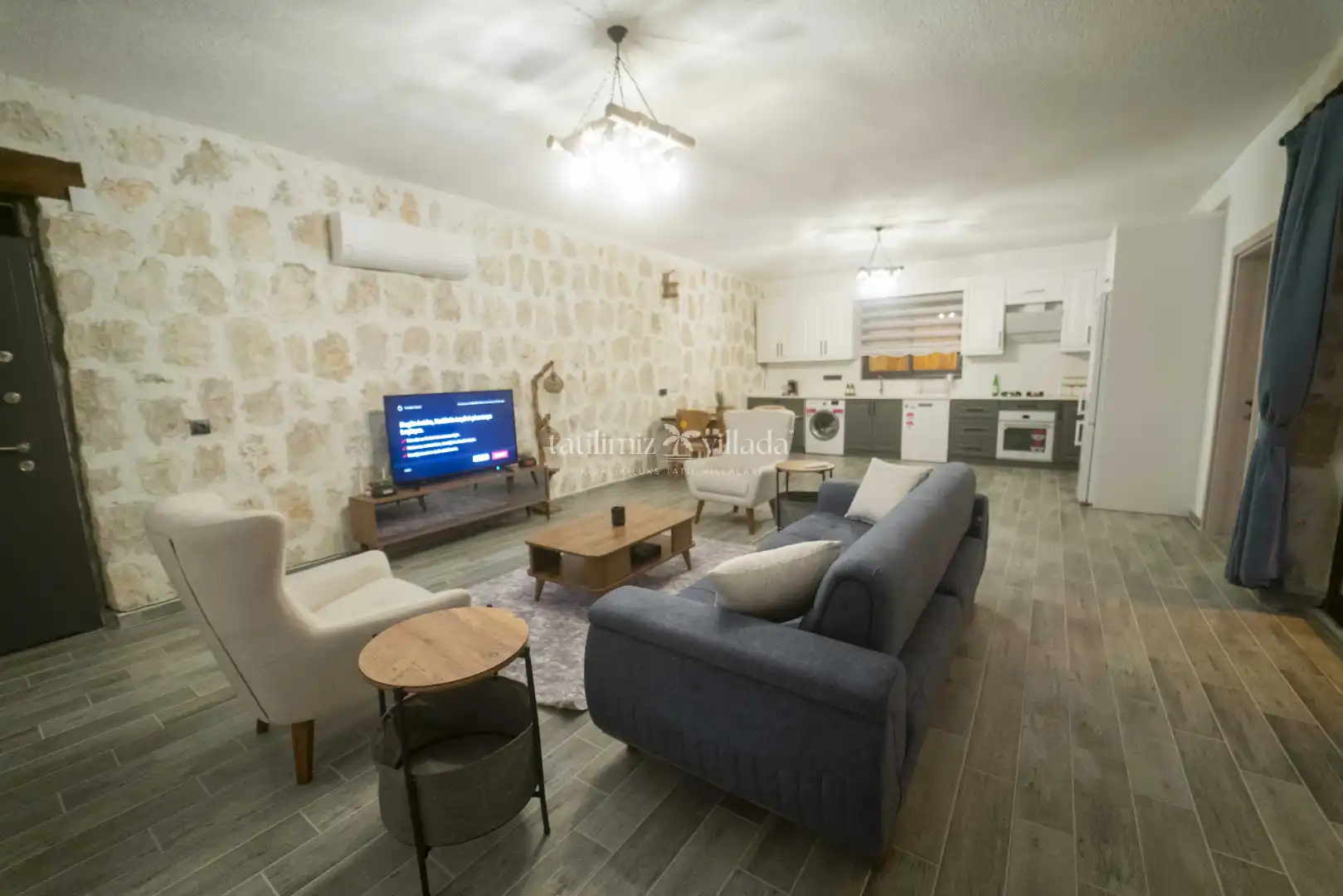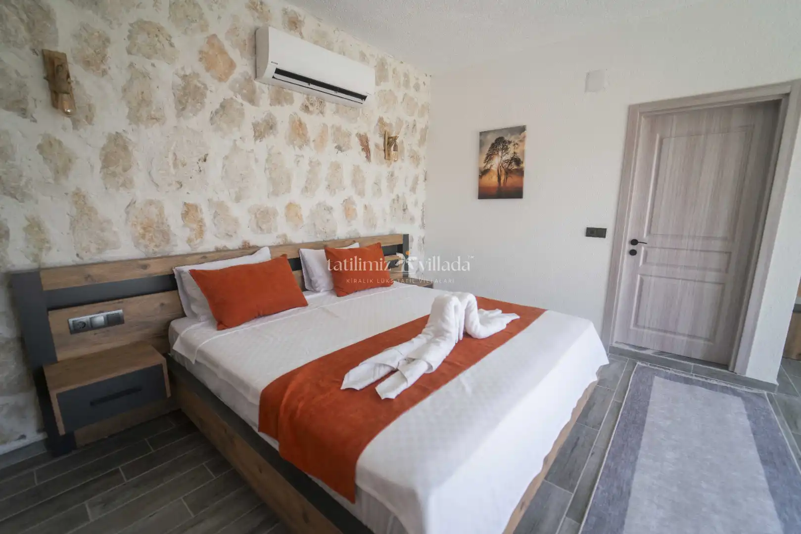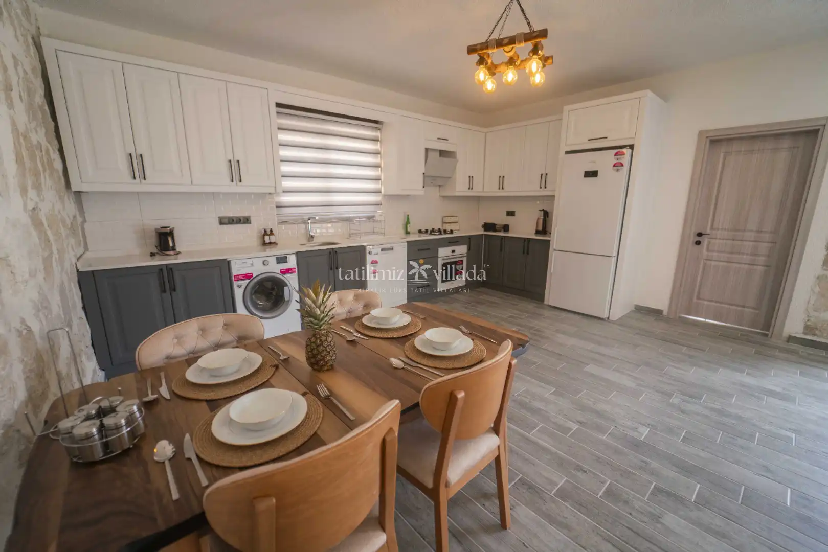 Modern ve ferah bir mimariye sahip olan villada 2 yatak odası, 1 salon, tam donanımlı Amerikan mutfak ve konforlu bir yaşam alanı mevcuttur. Tüm eşyalar misafirlerin ihtiyaçlarını karşılayacak şekilde özenle seçilmiş olup, tatiliniz boyunca evinizin rahatlığını aratmayacak bir ortam sunar. Klima, televizyon, beyaz eşyalar ve mutfak gereçleri villada eksiksiz olarak yer almaktadır.