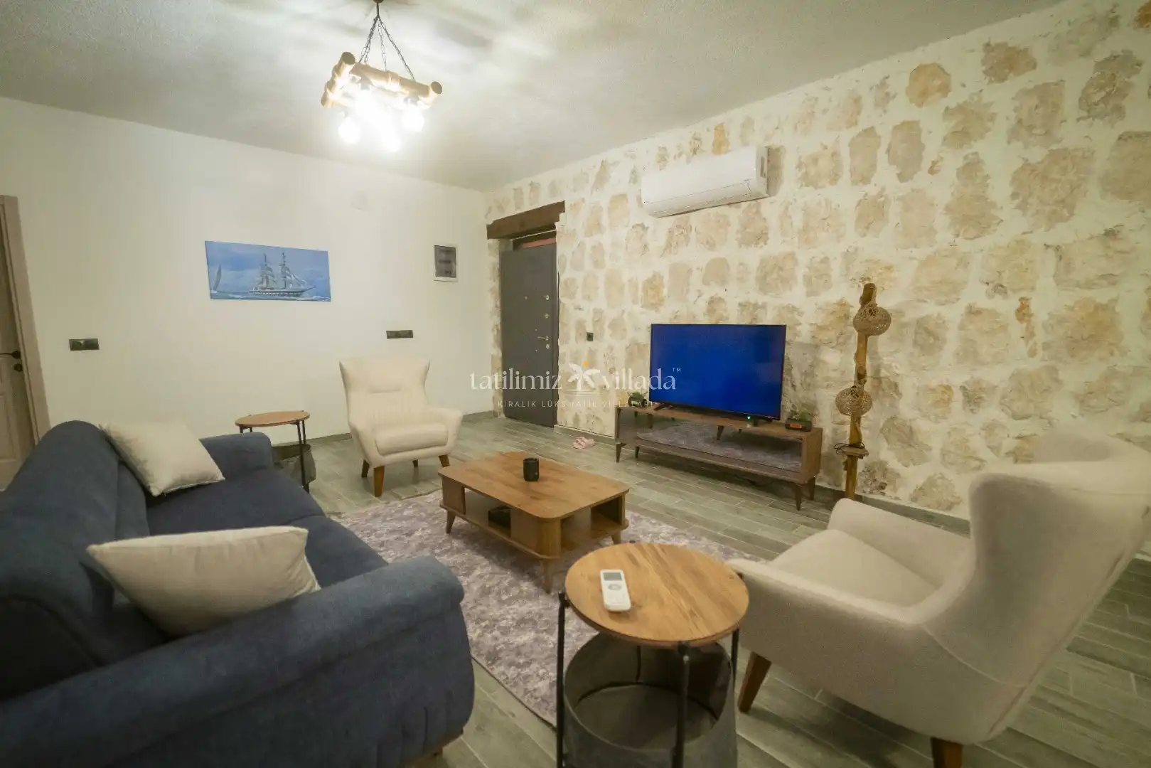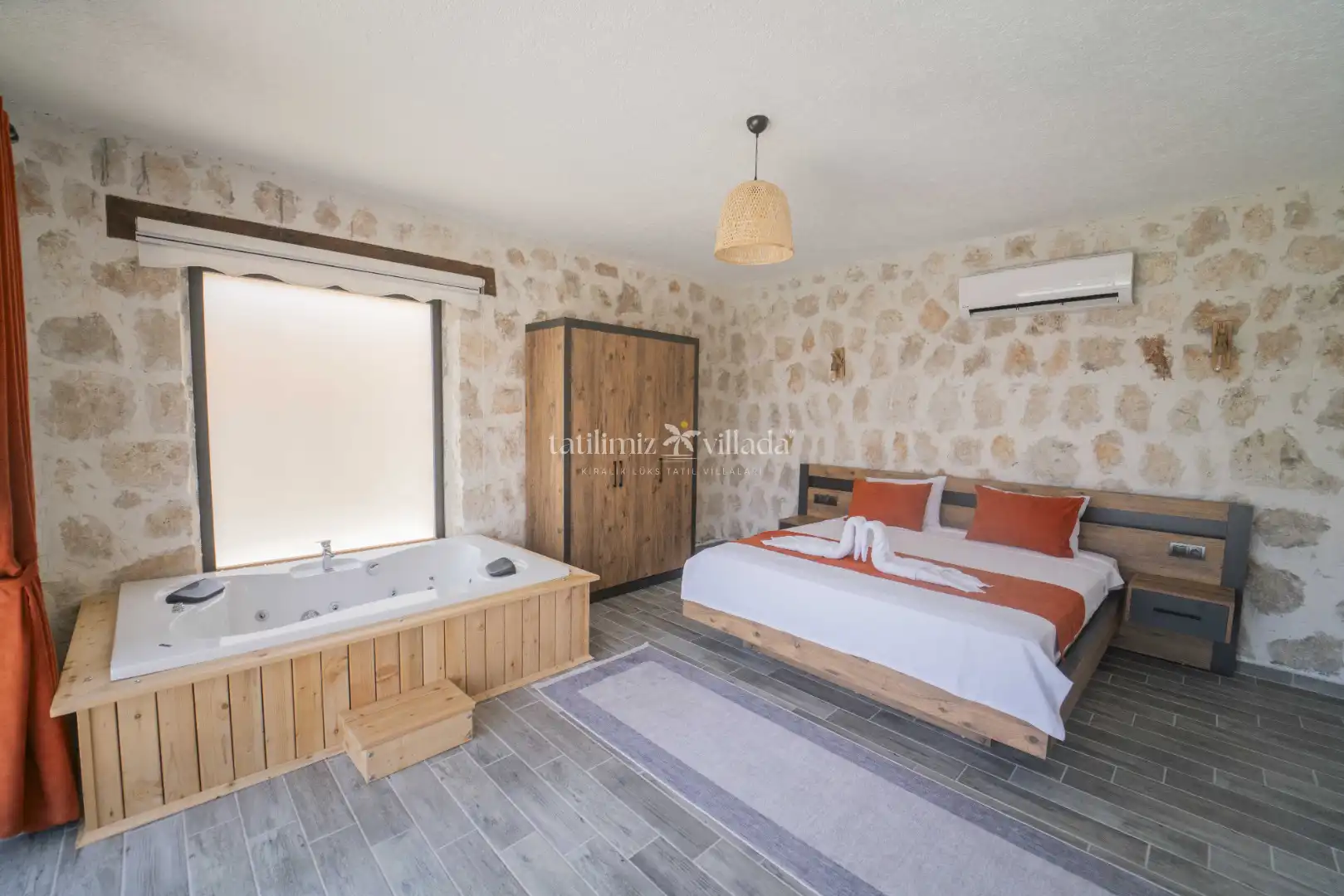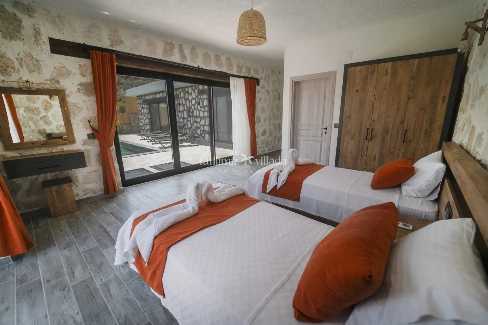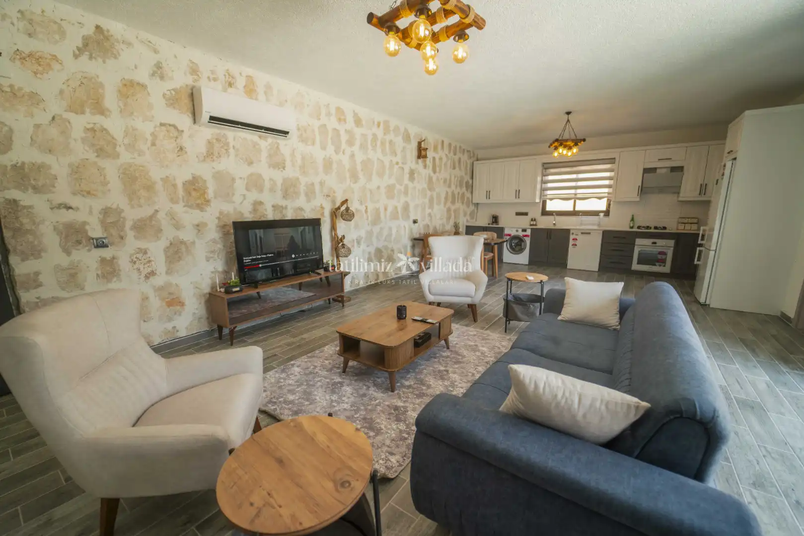 Modern ve ferah bir mimariye sahip olan villada 2 yatak odası, 1 salon, tam donanımlı Amerikan mutfak ve konforlu bir yaşam alanı mevcuttur. Tüm eşyalar misafirlerin ihtiyaçlarını karşılayacak şekilde özenle seçilmiş olup, tatiliniz boyunca evinizin rahatlığını aratmayacak bir ortam sunar. Klima, televizyon, beyaz eşyalar ve mutfak gereçleri villada eksiksiz olarak yer almaktadır.