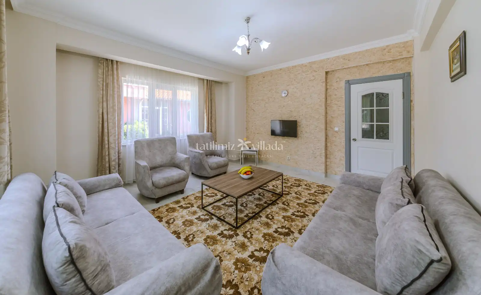 Villamız tesissiz olup site içi konseptte yer almakta, bu sayede otel kalabalığı ve ortak alan yoğunluğu olmadan daha sakin ve özgür bir tatil imkânı sunmaktadır. Çay kaşığından mangal ve barbekü ekipmanlarına kadar tüm detayları düşünülmüş tam donanımlı mutfak, ev konforunda yemek hazırlamanıza olanak tanırken, geniş ve konforlu salon alanı sevdiklerinizle keyifli vakit geçirmeniz için ideal bir ortam sağlar.