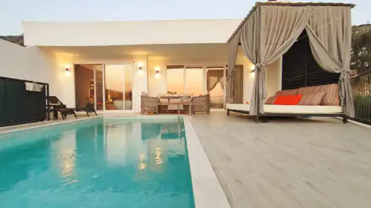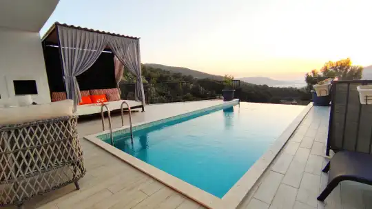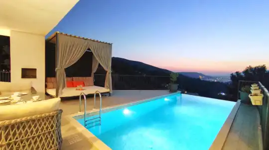 Dış mekânda ise size özel yüzme havuzu, şezlonglar ve oturma alanları ile güneşin ve temiz havanın tadını doyasıya çıkarabilirsiniz. Doğayla iç içe olan konumu sayesinde sabahları kuş sesleriyle uyanabilir, akşamları ise Kalkan’ın eşsiz gün batımı manzarasına tanıklık edebilirsiniz.