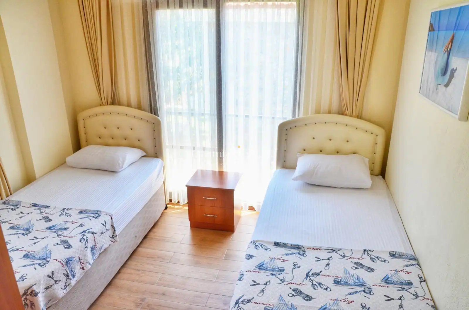 Alt katta geniş bir salon ve mutfak bulunurken, üst katta 2 yatak odası yer almaktadır. Yatak odalarından biri iki tek kişilik yatak, diğer odası ise üç tek kişilik yatak ile donatılmıştır. Üst katta ayrıca 1 adet ortak banyo bulunmaktadır.