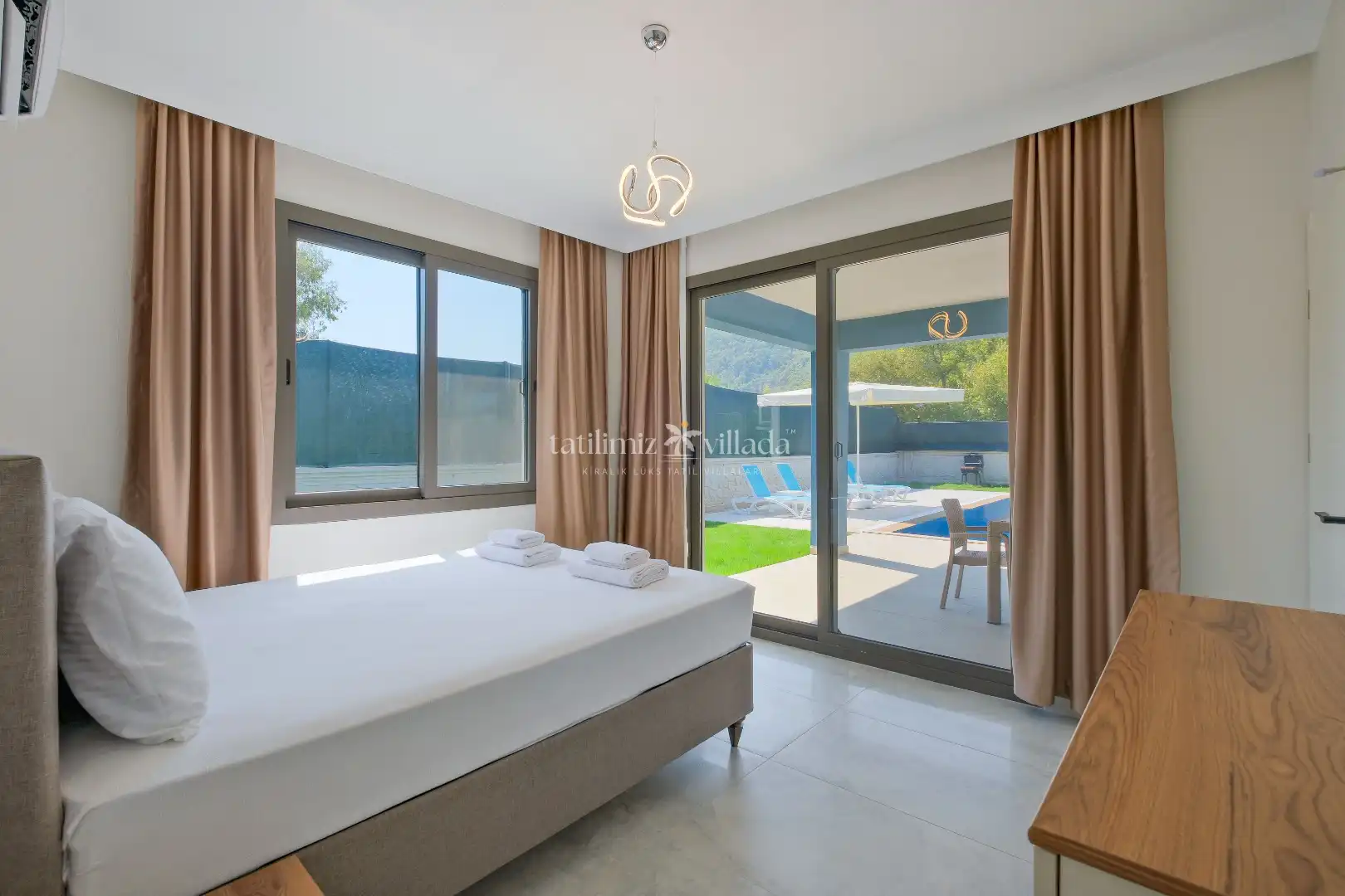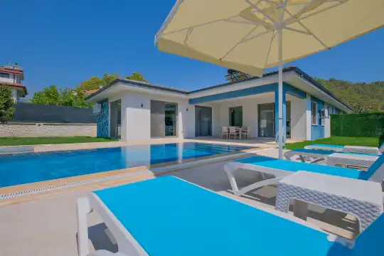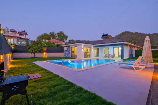 Doğanın içinde modern tasarımı ile dikkat çeken villamız, sevdiklerinizle birlikte güvenli ve huzurlu bir tatil geçirmeniz için özenle tasarlanmıştır. Yeşilin her tonuna hakim konumuyla ön plana çıkan villanın geniş havuz terasında şezlong takımı, konforlu oturma grubu, barbekü alanı ve minik misafirler için özel olarak düşünülmüş çocuk havuzu bulunmaktadır. Bu yönüyle villa, özellikle aileler için ideal bir çocuk havuzlu kiralık villa seçeneği sunmaktadHavuz terasına açılan konforlu oturma odası ve donanımlı açık mutfağı kullanım kolaylığı sağlamaktadır. Birinci yatak odasında çift kişilik yatak ve ebeveyn banyosu, ikinci yatak odasında çift kişilik yatak ve ebeveyn banyosu, üçüncü yatak odasında ise iki adet tek kişilik yatak bulunmaktadır.
