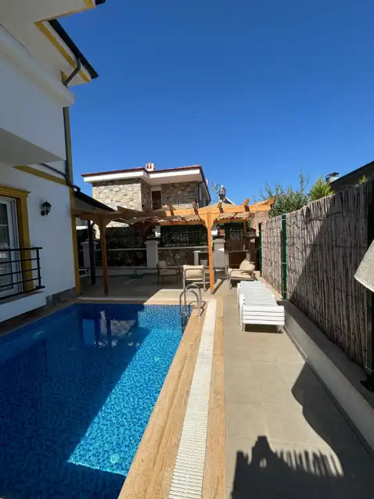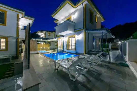 Villanın geniş bahçesinde özel yüzme havuzu, çocuklar için ayrı bir havuz alanı ve güneşlenme terası bulunur. Gün boyu havuz başında serinleyebilir, sevdiklerinizle birlikte güneşin tadını çıkarabilirsiniz. Modern tasarımlı iç mekânında konforlu oturma alanı, tam donanımlı mutfak ve ferah yatak odaları yer alır. Villanın her detayı, misafirlerin ev konforunu tatil keyfiyle birleştirmesi için özenle düşünülmüştür.