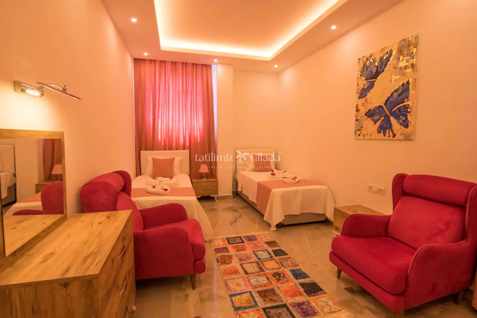 2 yatak odasına sahip olan villamız, 4 kişilik konaklama kapasitesi ile hem çekirdek aileler hem de arkadaş grupları için ideal bir seçenektir. Modern ve kullanışlı iç tasarımı, ferah yaşam alanları ve konfor odaklı yapısı sayesinde tatiliniz boyunca ihtiyacınız olan tüm detaylar düşünülmüştür.