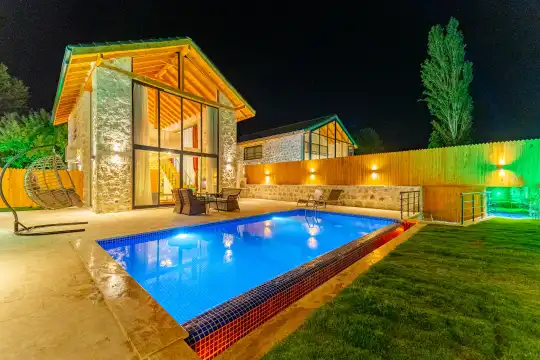 Modern ve şık dekorasyonuyla dikkat çeken Villa Vega, 2 kişilik konaklama kapasitesine sahiptir. Geniş ve ferah yatak odasında konforlu bir çift kişilik yatak ve özel jakuzi bulunmaktadır. Jakuzili alan, günün yorgunluğunu atarken doğanın huzurunu hissetmenizi sağlar. Salon bölümü ve açık mutfak alanı kullanışlı bir şekilde tasarlanmıştır; yemek yapma ve dinlenme ihtiyaçlarınıza cevap verir.
