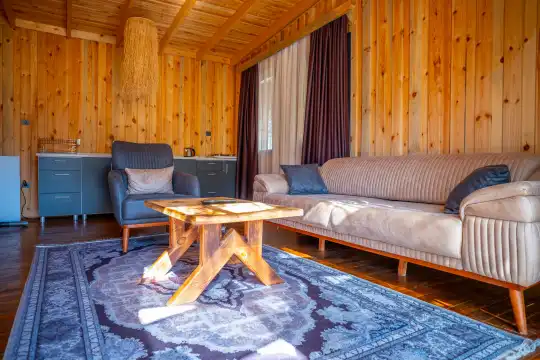 Modern ve şık detaylarla döşenmiş iç mekanı, ferah bir oturma alanı ve konforlu bir yatak odasından oluşmaktadır. Açık plan mutfak, temel ihtiyaçları karşılayacak şekilde donatılmıştır. Bu alan, misafirlerin kendi yemeklerini hazırlayıp doğayla baş başa keyifli anlar yaşamalarına olanak tanır. Yatak odasında yer alan çift kişilik yatak, rahatlığıyla ön plana çıkarken, dekorasyonda kullanılan doğal dokular ortama sıcaklık katar.