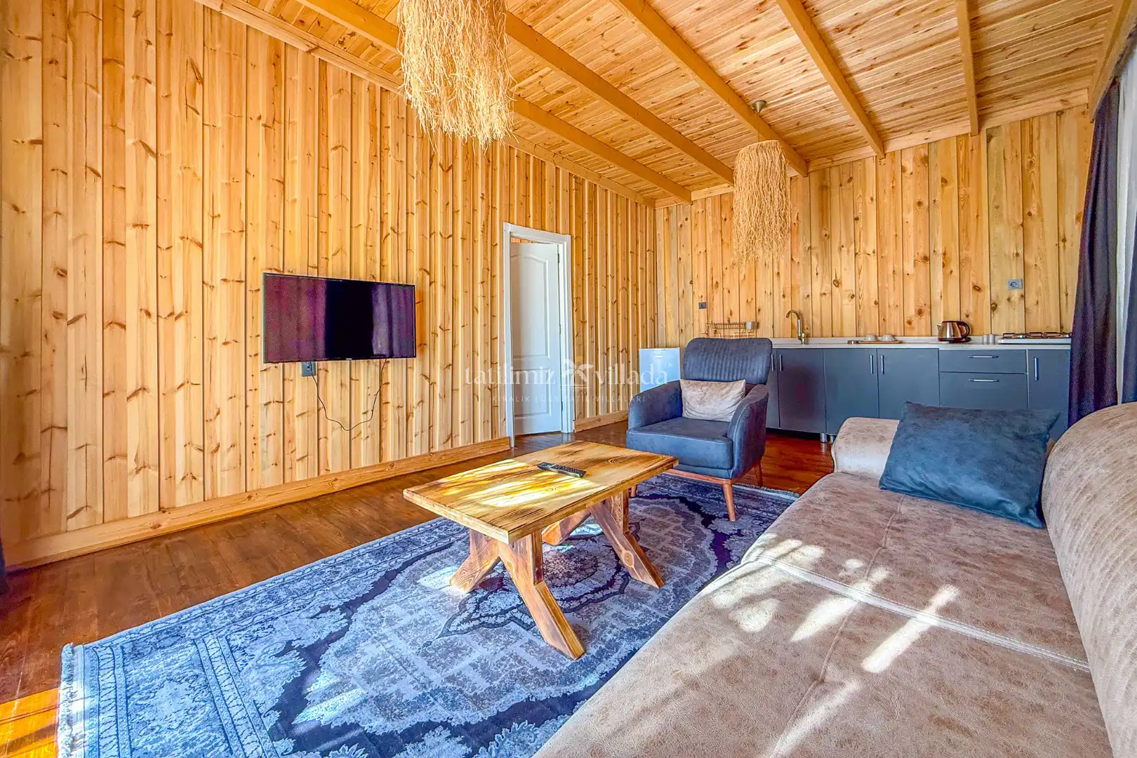 Modern ve şık detaylarla döşenmiş iç mekanı, ferah bir oturma alanı ve konforlu bir yatak odasından oluşmaktadır. Açık plan mutfak, temel ihtiyaçları karşılayacak şekilde donatılmıştır. Bu alan, misafirlerin kendi yemeklerini hazırlayıp doğayla baş başa keyifli anlar yaşamalarına olanak tanır. Yatak odasında yer alan çift kişilik yatak, rahatlığıyla ön plana çıkarken, dekorasyonda kullanılan doğal dokular ortama sıcaklık katar.
