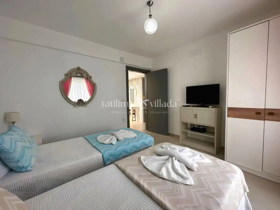 Dalyan Nehri’ne yakın konumda bulunan villamızda; şezlong, salıncak, barbekü alanı ve açık hava oturma grubu yer almaktadır. Havuz terasına açılan konforlu salon, tam donanımlı açık mutfak ve iki ortak banyo kullanım kolaylığı sağlamaktadır. Birinci yatak odasında çift kişilik yatak ve özel banyo, ikinci ve üçüncü yatak odalarında çift kişilik yatak, dördüncü yatak odasında ise iki adet tek kişilik yatak bulunmaktadır.