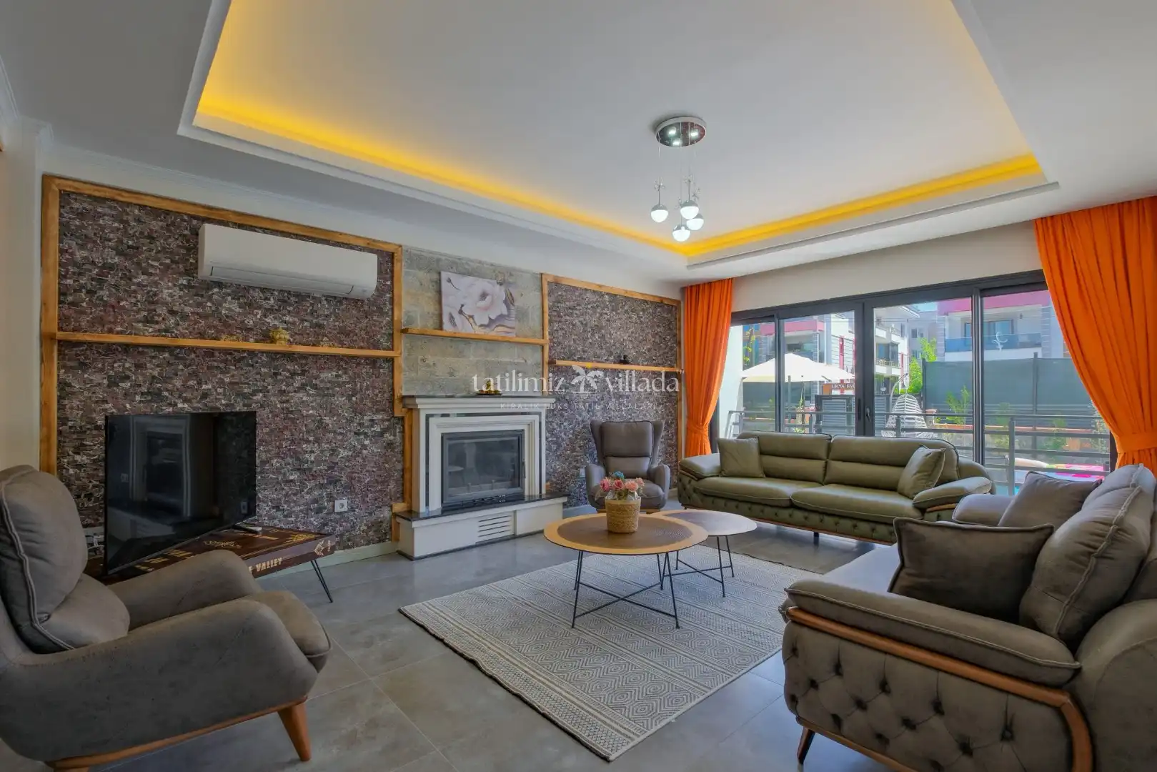 Açık plan mutfak ve salon alanı; geniş oturma grubu, televizyon ve klima ile donatılmış olup, misafirlerin birlikte keyifli vakit geçirebileceği ferah bir yaşam alanı sunar. Tam donanımlı mutfak sayesinde tatil süresince ihtiyaç duyulabilecek tüm ekipmanlar mevcuttur. Özel yüzme havuzu ise günün yorgunluğunu atmak ve serinlemek isteyen misafirler için ideal bir alan sağlar.