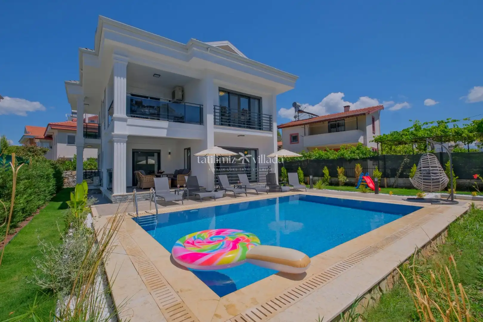 Villa White Palm 3, Fethiye’nin merkezi ve en çok tercih edilen bölgelerinden biri olan Babataşı Mahallesi’nde konumlanan, özel havuzlu ve saunalı modern bir Fethiye kiralık villa alternatifidir. Şehir merkezine sadece birkaç dakika mesafede yer alan villa, hem konforlu hem de ulaşım açısından avantajlı bir tatil yapmak isteyen misafirler için ideal bir seçenektir. 5 yatak odası ve 9 kişilik konaklama kapasitesi sayesinde geniş aileler ve arkadaş grupları için oldukça uygundur.