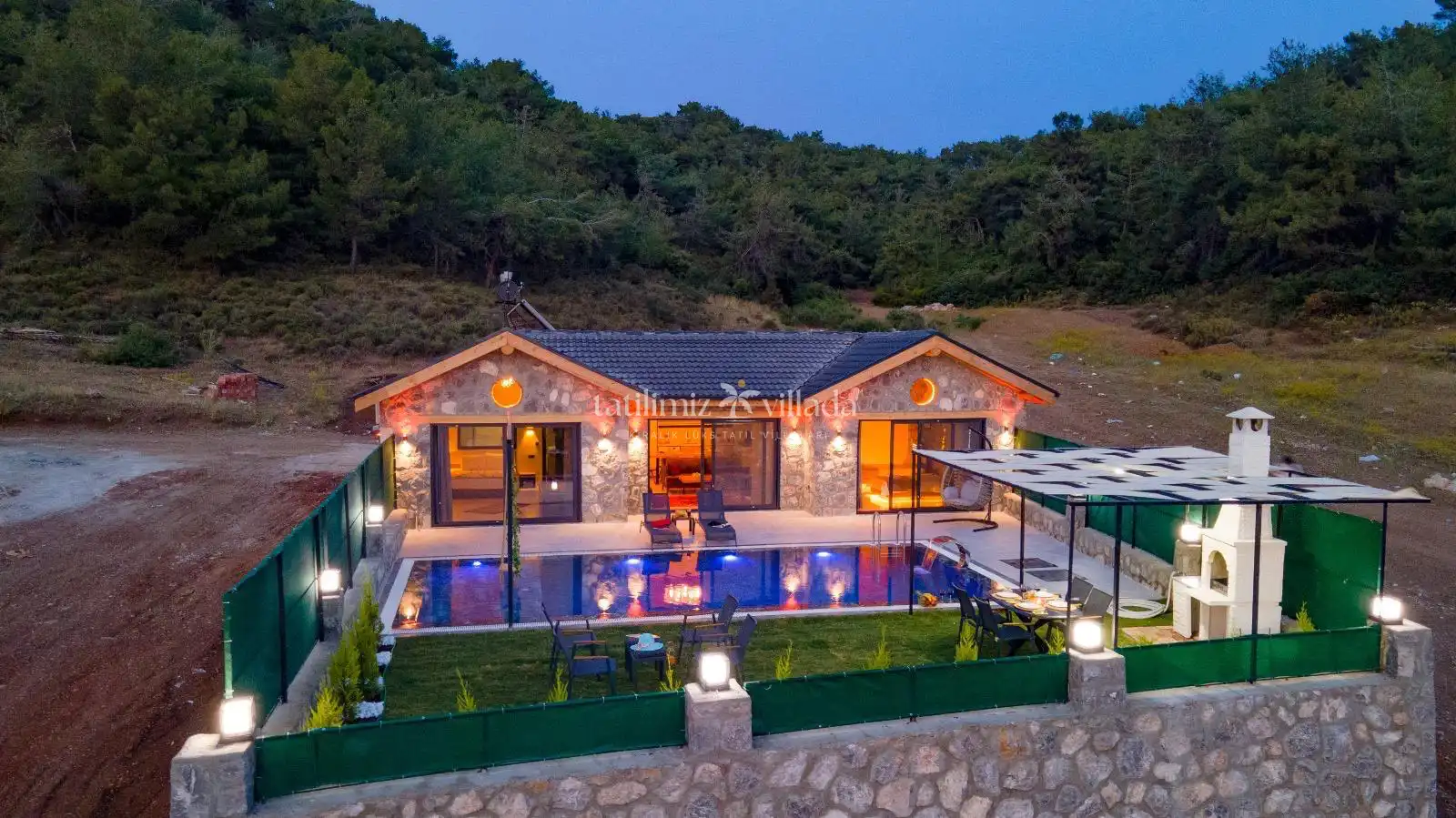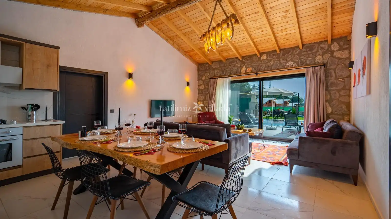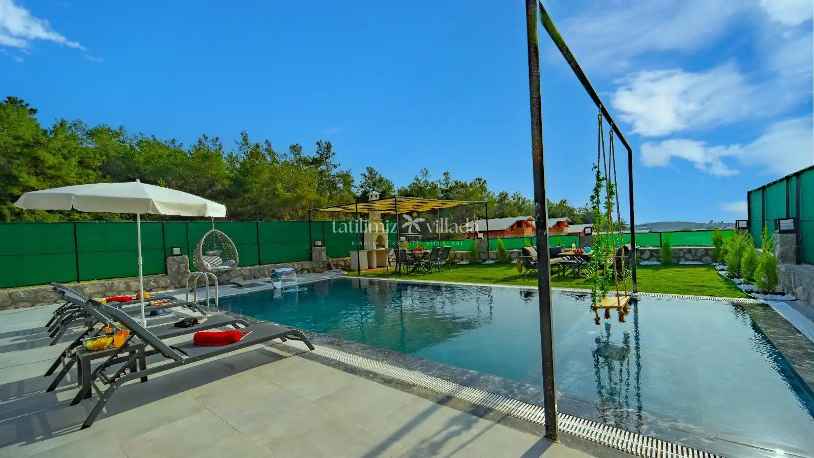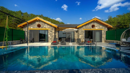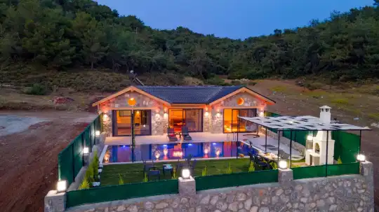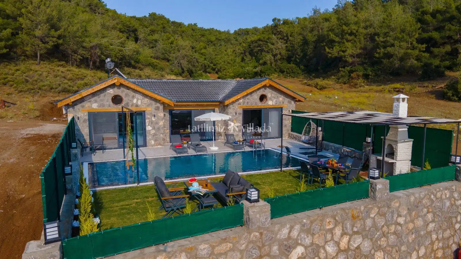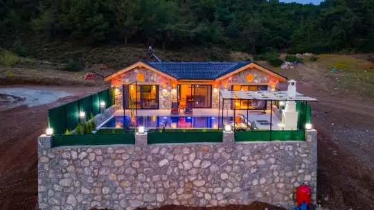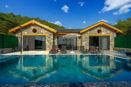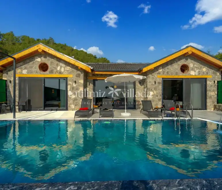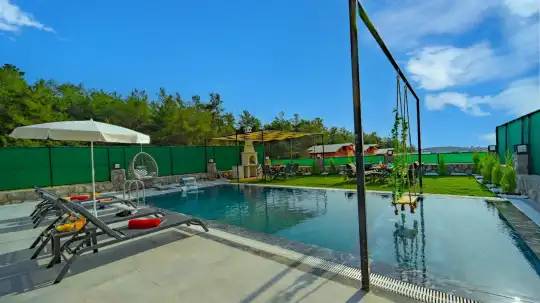 Villamızın taş mimarisi, bölgenin doğasıyla uyumlu bir şekilde şıklık ve doğallığı bir araya getirir. Geniş havuz terası, rahat bahçe mobilyaları ve sığ havuz alanındaki salıncağı ile açık havada hem eğlenceli hem de dinlendirici vakit geçirebilirsiniz.