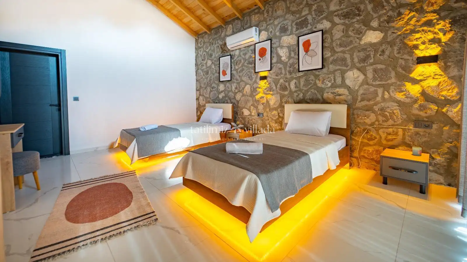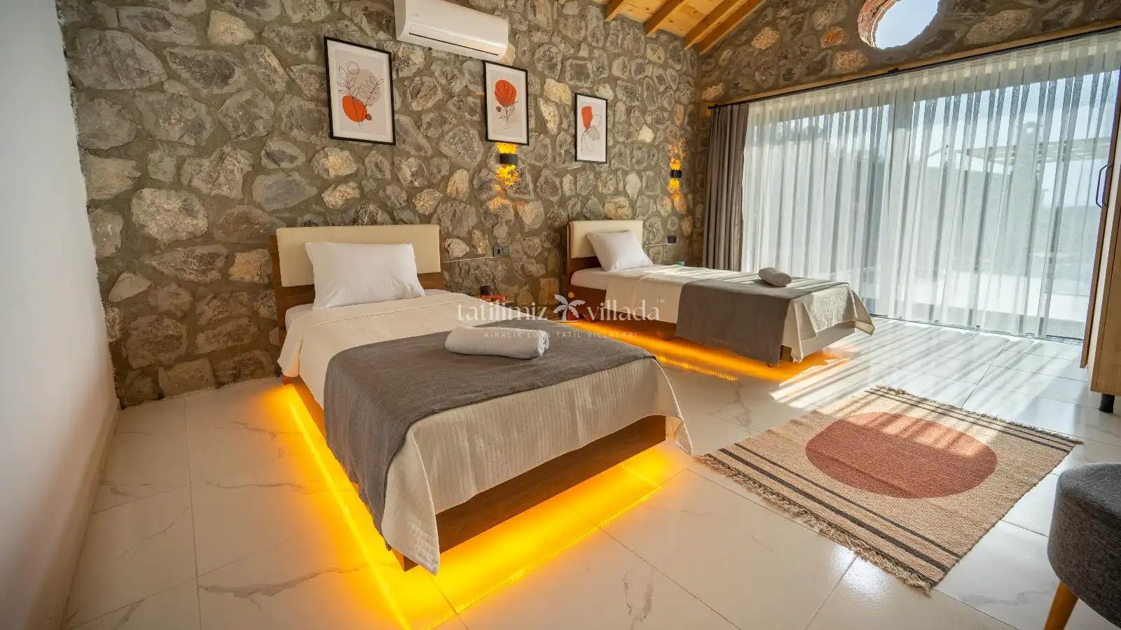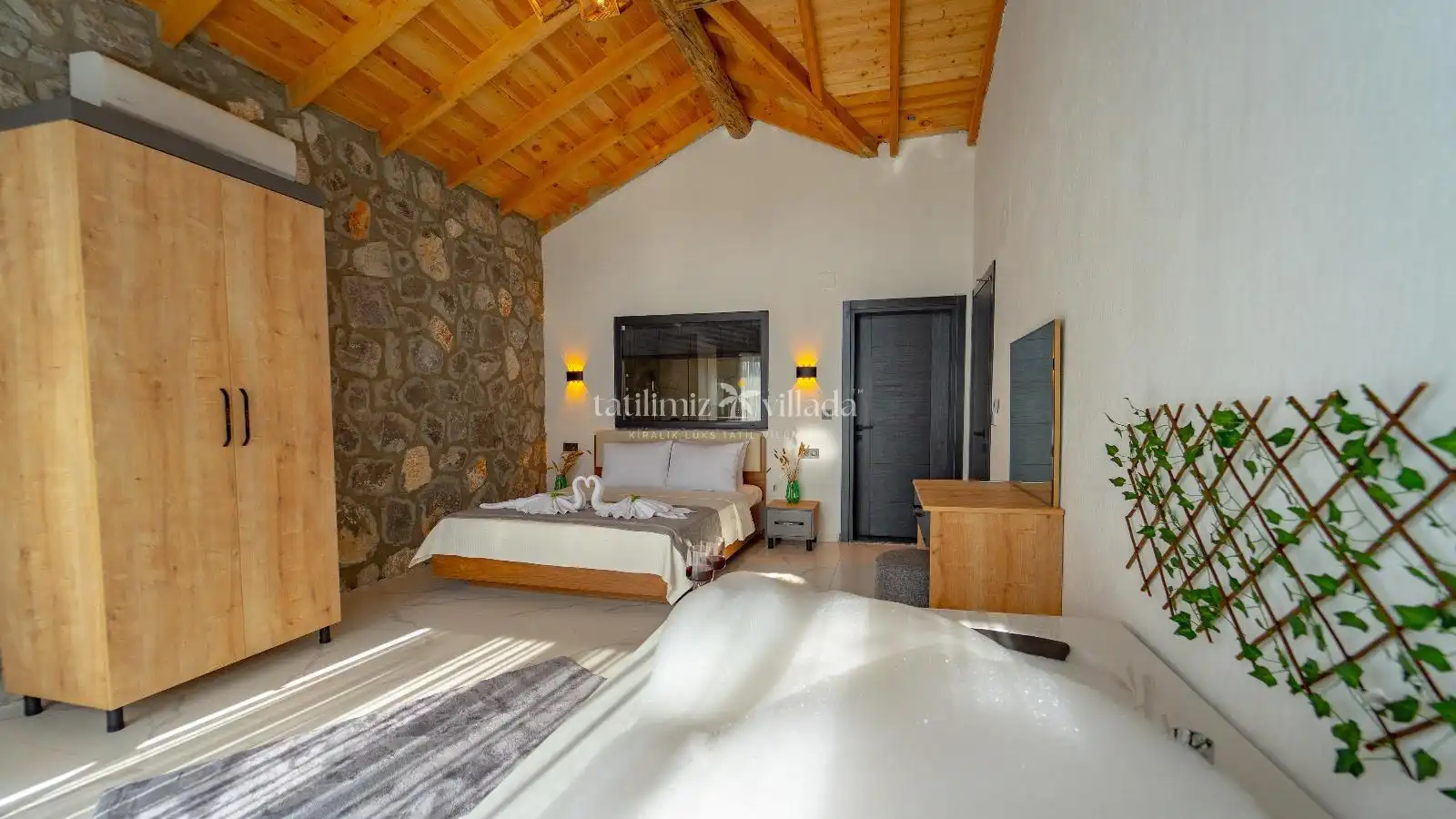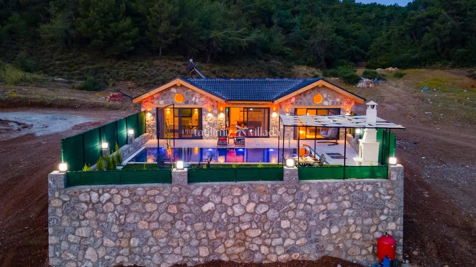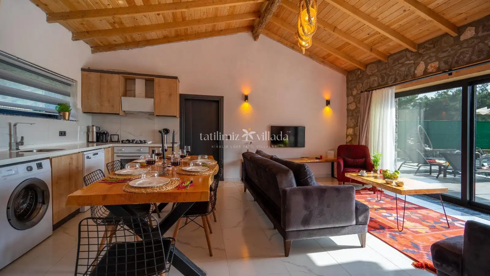 Villamızın taş mimarisi, bölgenin doğasıyla uyumlu bir şekilde şıklık ve doğallığı bir araya getirir. Geniş havuz terası, rahat bahçe mobilyaları ve sığ havuz alanındaki salıncağı ile açık havada hem eğlenceli hem de dinlendirici vakit geçirebilirsiniz.
