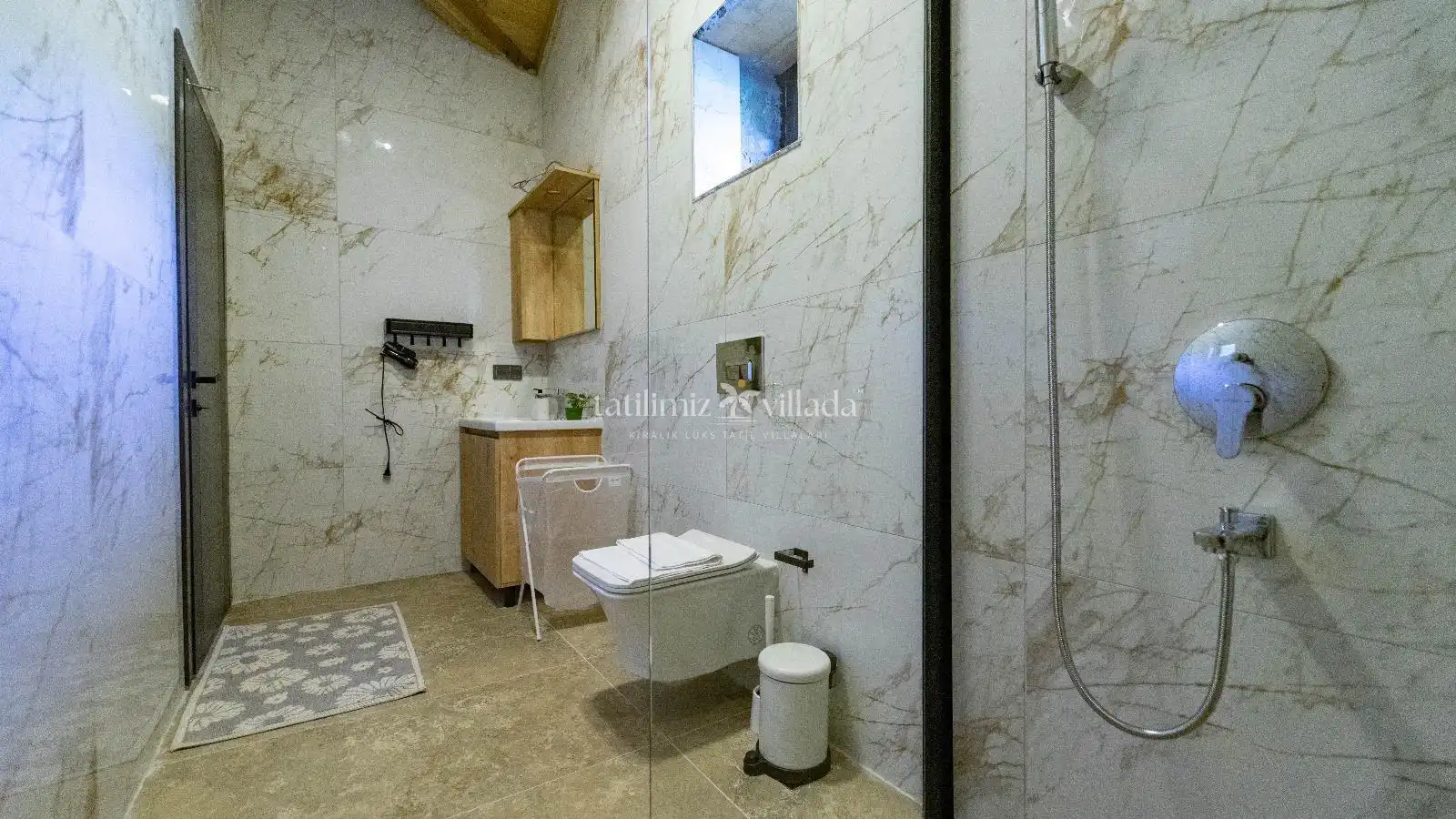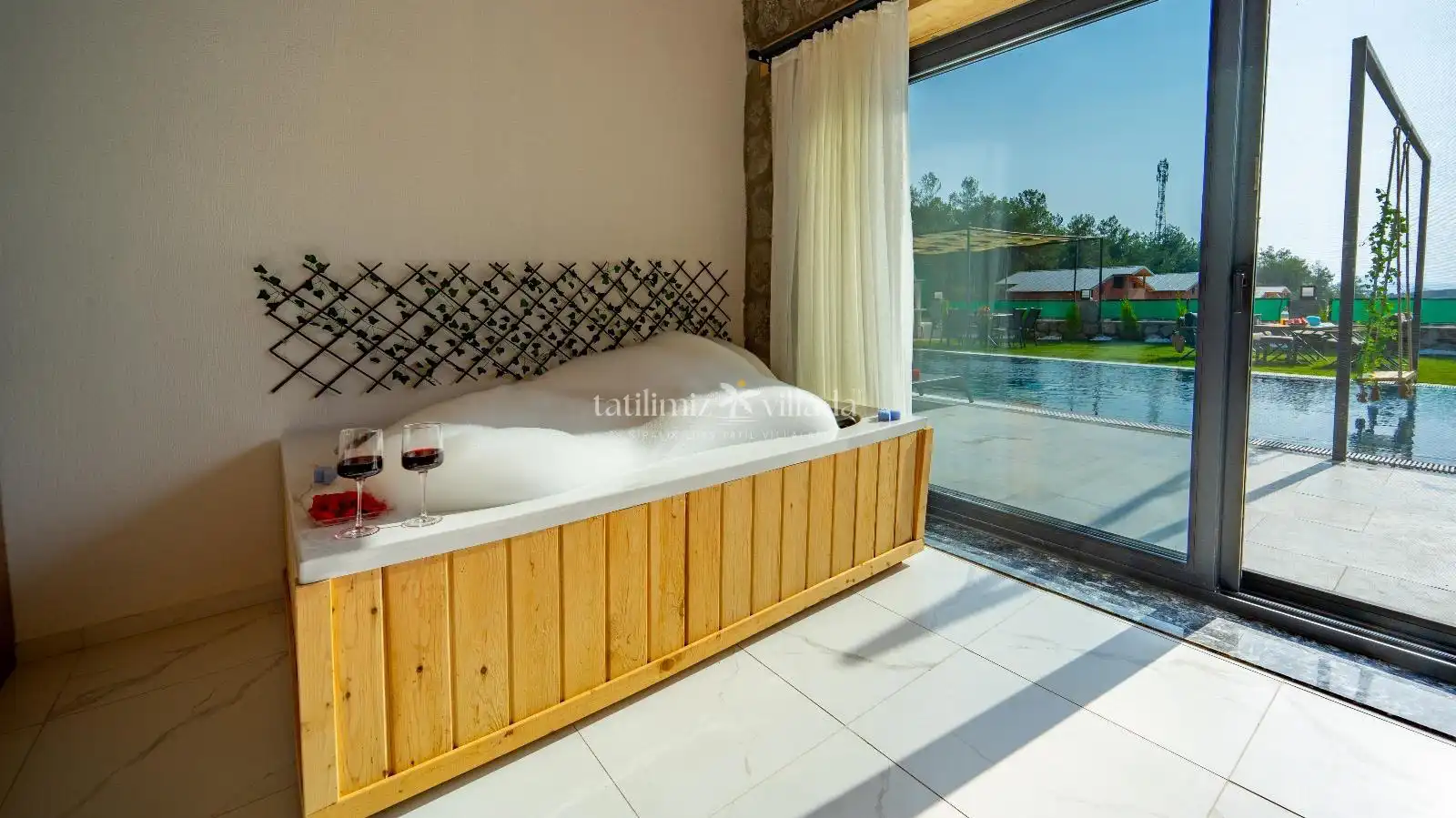 İç mekân modern ve şık tasarımıyla ferah bir yaşam alanı sunar. Ebeveyn yatak odasındaki jakuzisi, günün yorgunluğunu atmanız için özel bir alan sağlar. Villada ayrıca sauna bulunmakta olup, tatilinizi her açıdan keyifli hâle getirmektedir. Salon ve mutfak alanları, modern donanımlarla tam donatılmıştır; konforunuz ve kullanım kolaylığınız düşünülerek hazırlanmıştır.